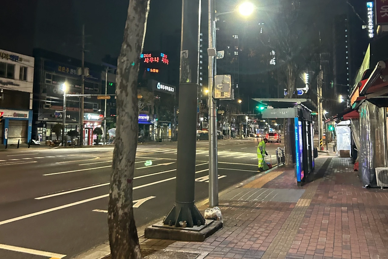 머리끝부터 발끝까지 야광 점프슈트를 입은 환경미화원 한 명을 만났다.