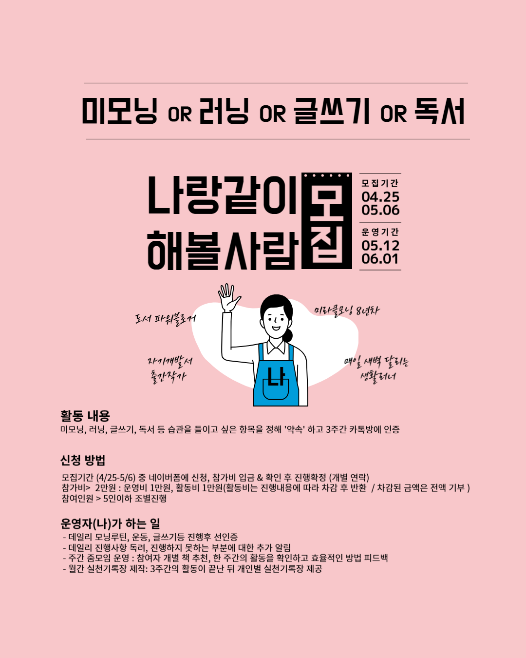 1명이지만 잘 끝내고 5월에는 주 초의 연휴를 피해 일찌감치 모집을 시작했고, 사람이 더 늘 수 있는 방법은 무엇인가? 그간의 모집을 위한 홍보포스터가 이상한가 싶어서 포스터 디자인을 아예 바꾸었다.