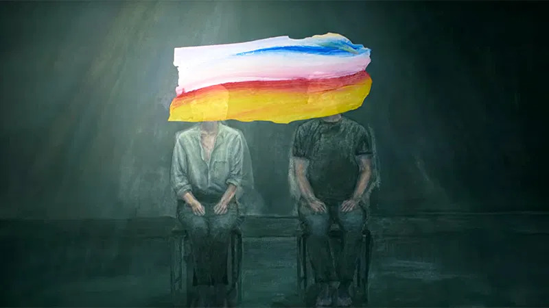 마주 선 두 사람 사이 끼어있는 풍선. 터지기 일보 직전, 그럼에도 울렁이는 것을 멈출 수 없는 두 사람의 모습은 데이빗과 새라가 여정을 떠나는 모습 같다. 어쩌면 견딜 수 없는 자신의 모습은 다른 사람의 눈에 '쌀 한톨만 한 어둠'일지도 모른다. 그래서 서로를 '비겁하고 나약하고 벗어나고 싶은 홀로인 당신'으로 보면서도, 옆에서 떠나지 않는다.