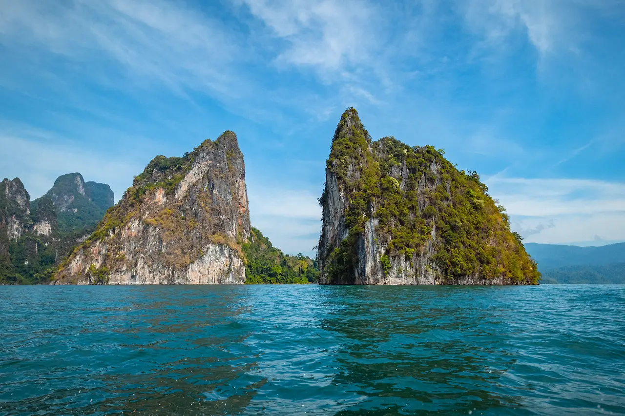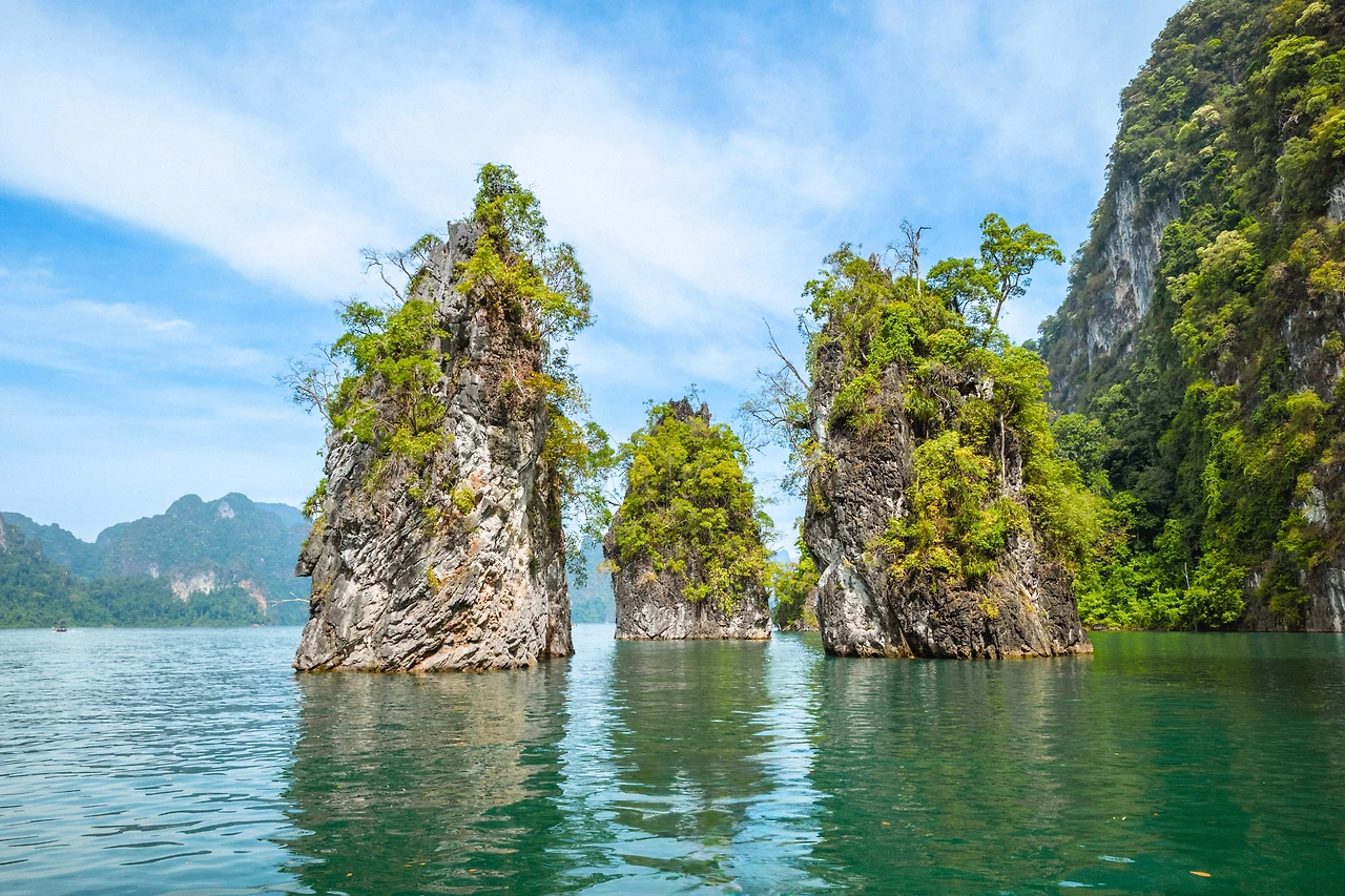 쩌우란 호수의 상징이자 하이라이트는 세 개의 석회암 봉우리 카오삼끌러(Khao Sam Kloe)다. ‘세 개의 봉우리’라는 의미의 이 지형은 마치 물에서 솟아오른 고대의 수호신처럼 호수를 지키고 있다. 석회암 카르스트 지형 특유의 수직 절벽과 그 절벽을 타고 자라는 나무들은 중국의 장가계(張家界), 베트남의 하롱베이(Ha Long Bay)와 견줄 만하지만, 호수라는 독특한 환경이 더해져 더욱 신비로운 풍경을 만들어낸다.