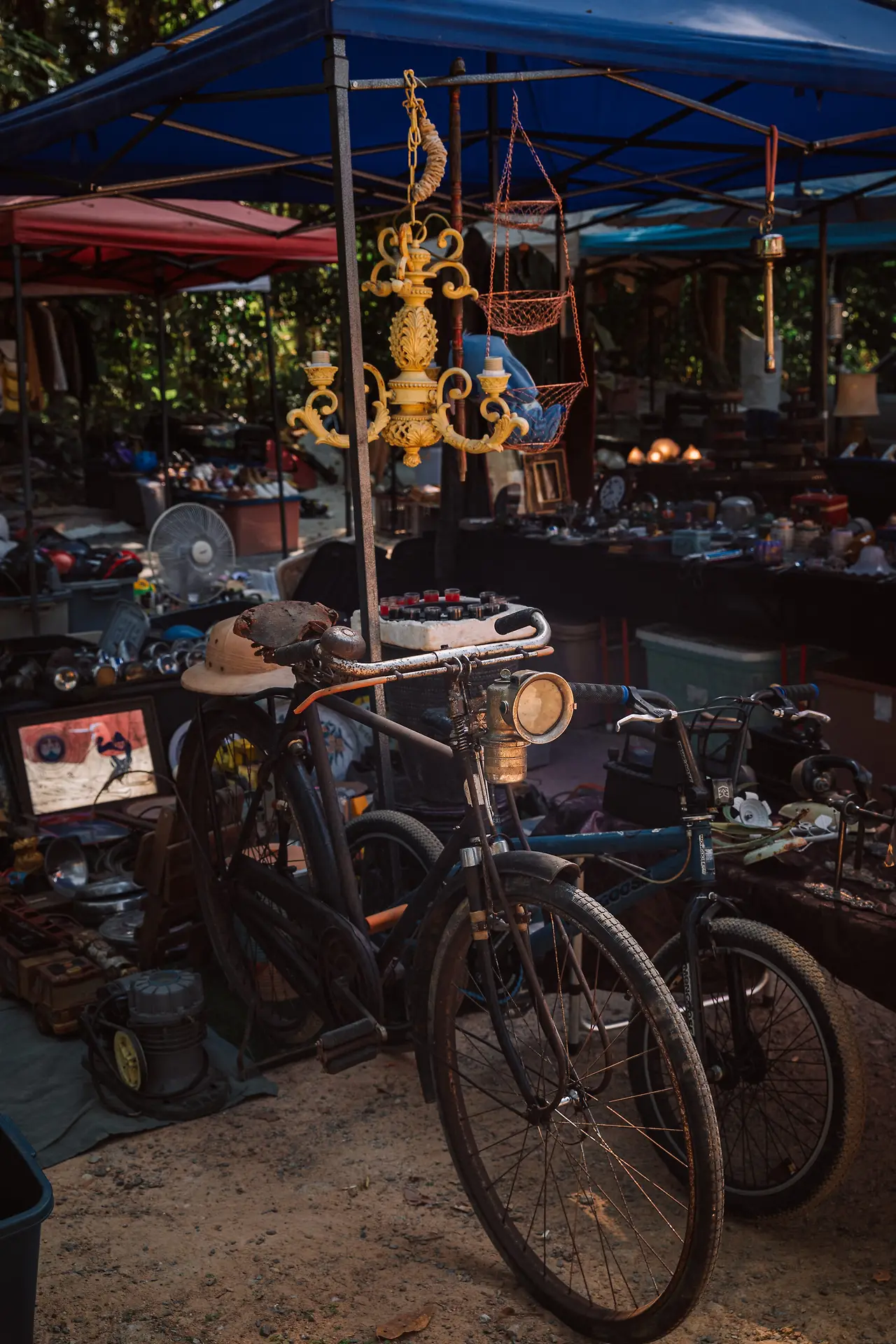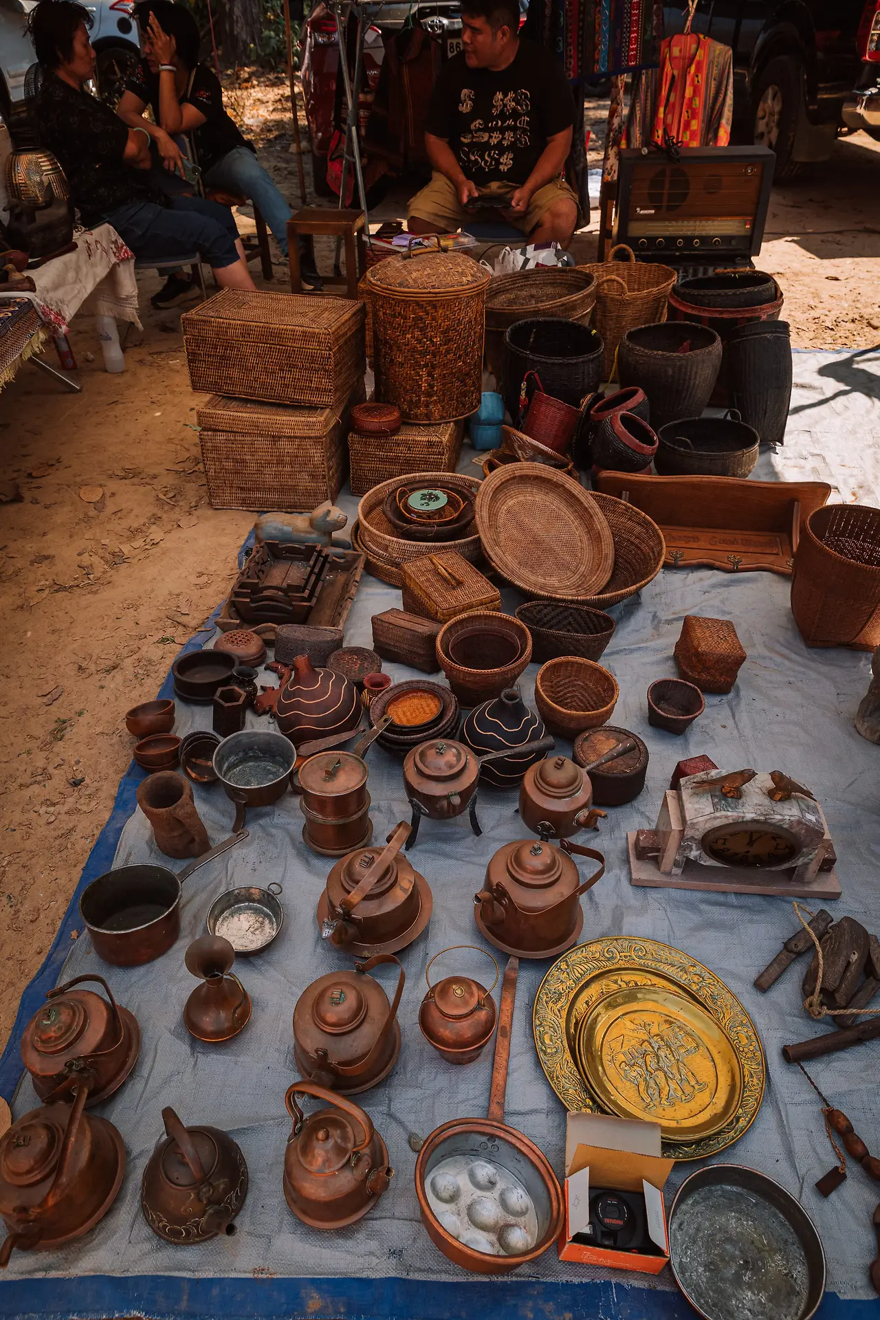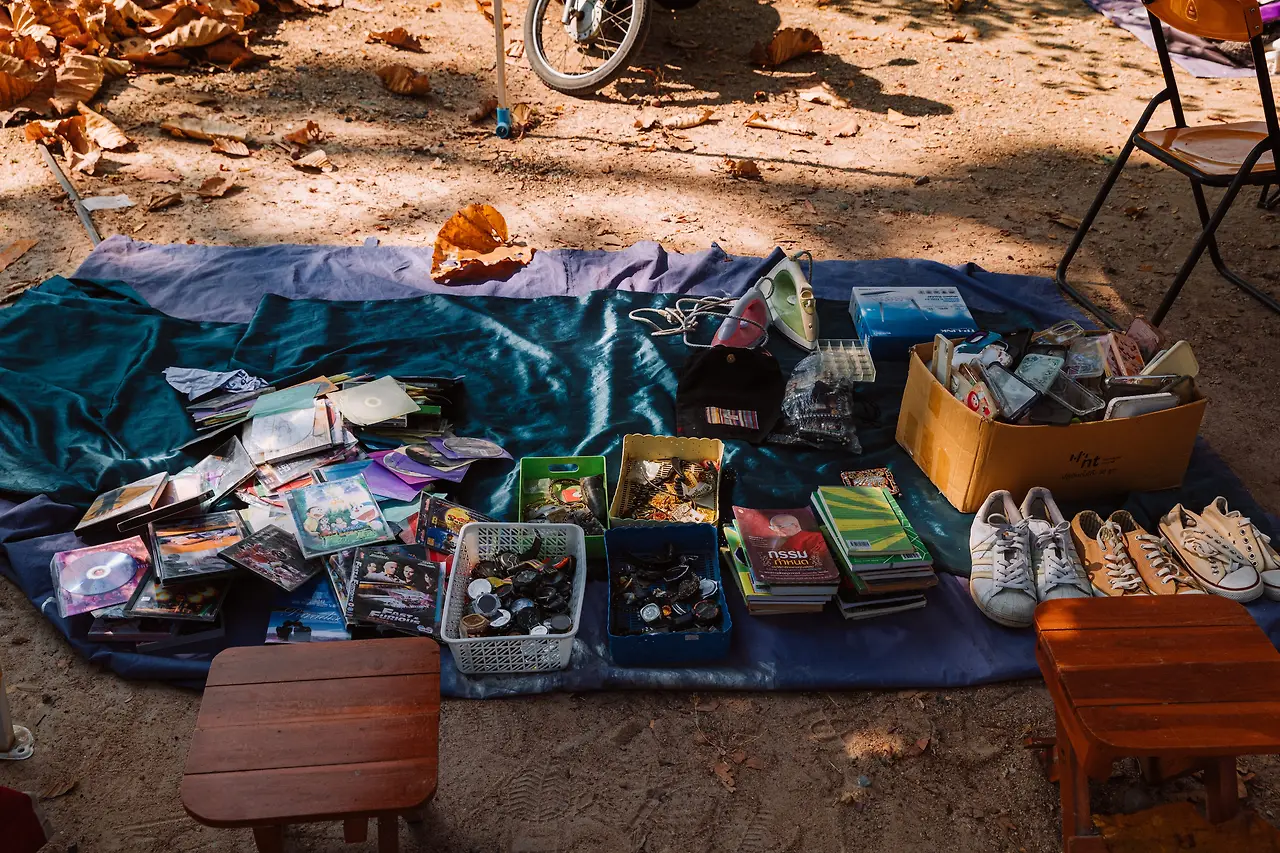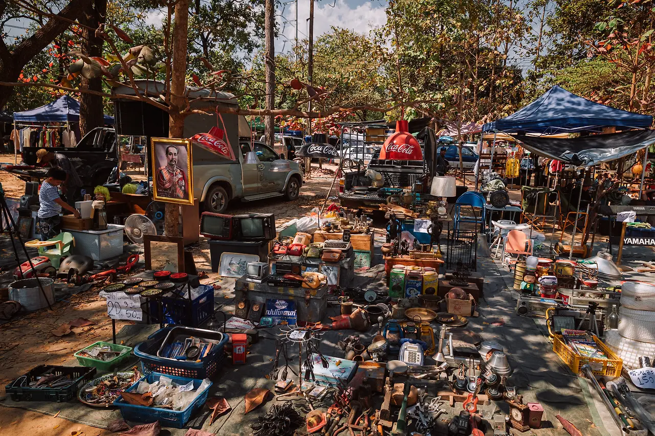 태국의 국화인(카시아(Cassia fistula) 태국어 이름 라차프륵(ราชพฤกษ์, 황금 샤워) 노란 꽃이 가득한 나무 아래로 햇살이 쏟아진다. 그 빛을 받으며 테이블 위에 펼쳐진 물건들을 구경하는 것만으로도 충분히 즐겁다. 기계, 가전, 가구, 그릇, 부처님 관련 불교물품, 하다못해 수전과 파이프 연결하는 플라스틱 엘보까지. 빈티지 옷과 장신구, 신발, 모자, 공예품, 장난감, 액세서리. 세상에 이런 물건도 있었지 하는, 이제는 사용할 일이 없는 집안의 가재도구들 — 호랑이 담배 피우던 시절의 호롱불, 숯 다리미. 여기가 한국판 동묘였다.