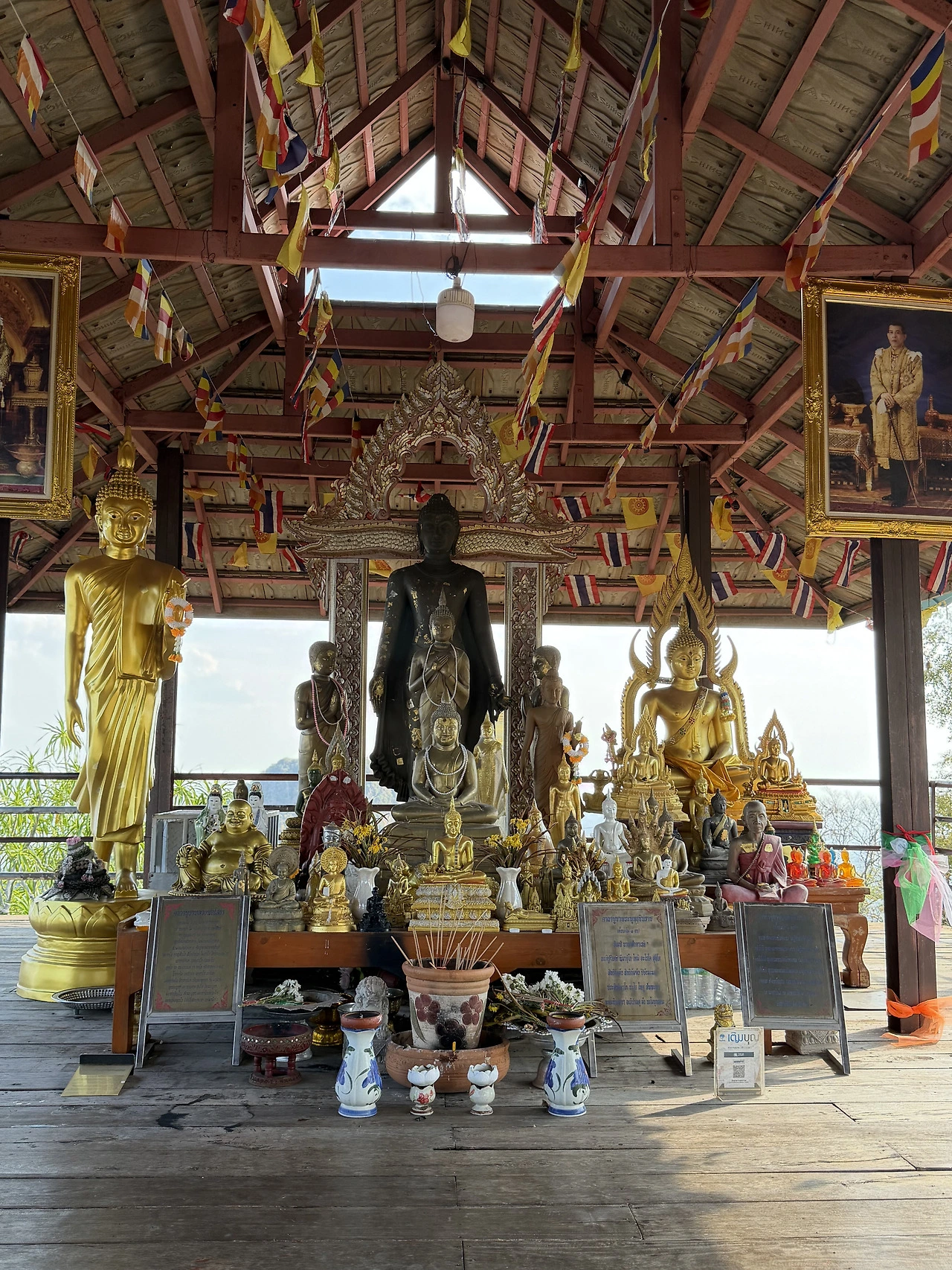 정상부에 마련된 법당에는 다양한 양식의 불상들이 모셔져 있다. 검은빛의 주존불을 중심으로 크고 작은 금불상들, 그리고 태국 국왕의 초상화가 나란히 걸려 있다. 목조 지붕 아래로 태국 국기와 불교기가 바람에 펄럭이고, 향과 꽃의 향기가 은은하게 퍼진다.