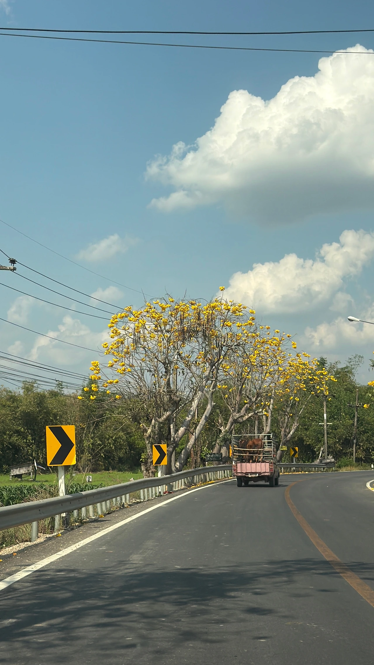노란 꽃나무가 도열한 시골 도로. 소를 실은 트럭이 느긋하게 달린다. 길가에 늘어선 나무들이 노란 꽃을 한가득 피워 올리고 있었다. 태국에서 "도크 끄라오(Dok Krao-정확하지 않을 수도)"라 부르는 이 나무는 건기인 1~2월에 잎을 모두 떨구고 대신 선명한 노란 꽃으로 가지를 채운다. 마치 태국판 벚꽃길 같은 이 풍경은 관광객에게는 잘 알려지지 않은 북부 건기의 숨은 선물이다.