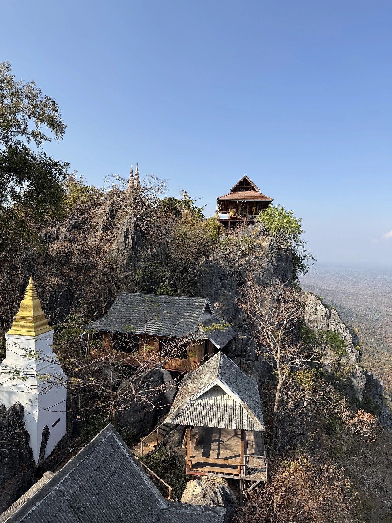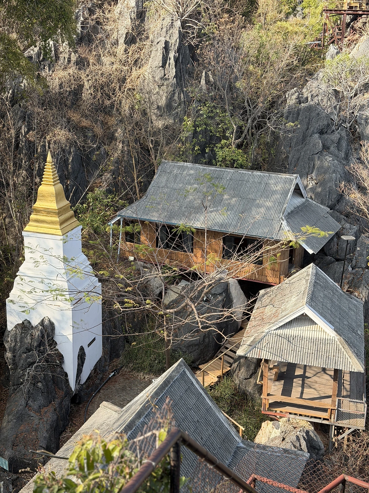 가파른 계단(거의 90도 직각)과 바위틈 사이를 오르다 보면, 서서히 시야가 트이기 시작한다. 그리고 마침내 고개를 들었을 때, 바위 봉우리 꼭대기에 올라앉은 하얀 체디(Chedi, 불탑)들이 눈에 들어온다. 마치 구름 위에 떠 있는 것 같은 이 체디들이야말로 이 사원이 "하늘 위의 사원"이라 불리는 이유다.