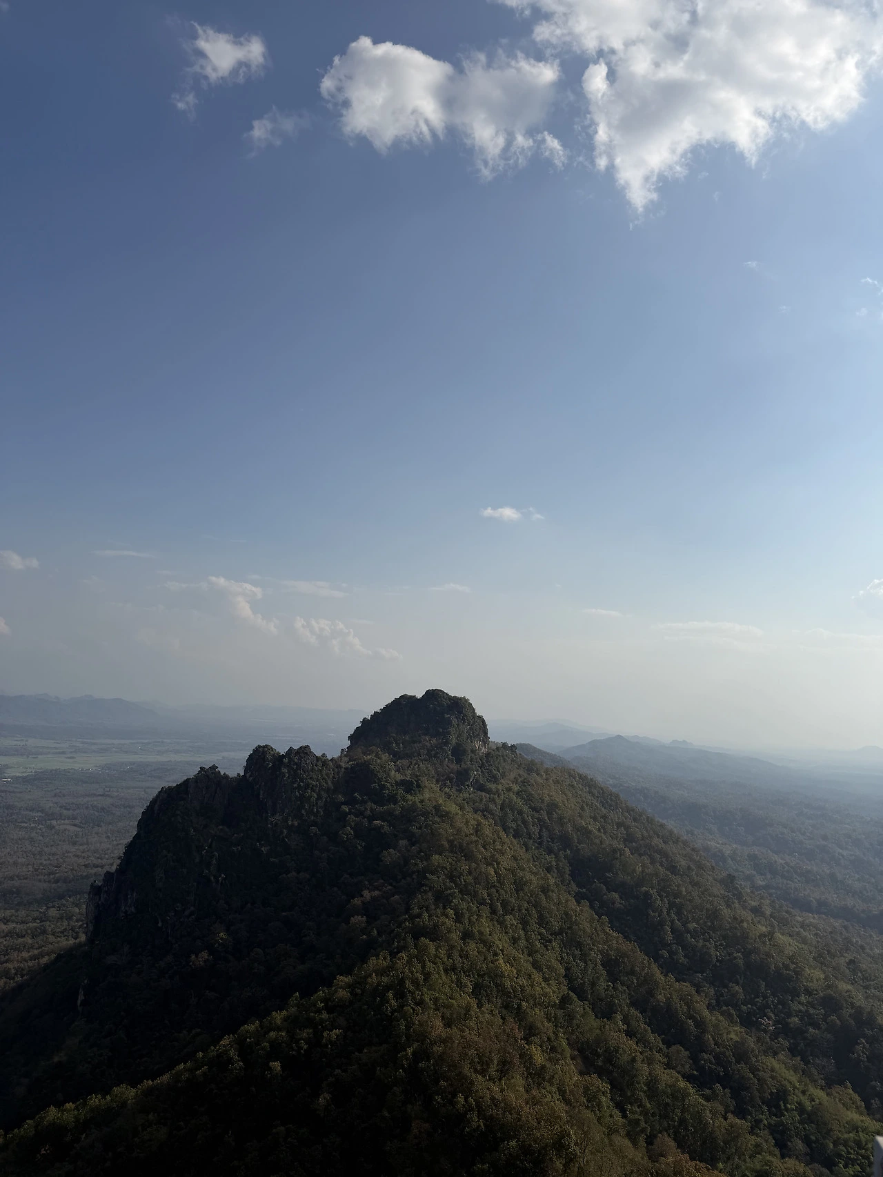 정상에서 바라보는 풍경은 숨이 멎을 듯하다. 사방으로 펼쳐진 람빵의 평야, 논과 밭이 패치워크처럼 이어지고, 작은 마을들이 점점이 흩어져 있다. 건기 특유의 옅은 안개가 산자락을 감싸고 있어, 마치 수묵화 속에 들어온 듯한 착각마저 든다.