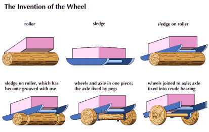 그러다가 언제부터였을까, 누군가가 물건을 끌고올 때 둥근 통나무들 위로 끌어보니 힘이 덜 들더라는 사실을 발견한 후, 인류는 점차 '물건을 끄는 것보다 굴리는게 낫다'는 사실을 이해해가게 된다. 물리학에서 '구름저항(rolling resistance)'로 알려져있는 현상이다. 이윽고 처음엔 그대로 쓰이던 통나무들은 무게를 줄이기 위해 필요없는 부분이 여기저기 잘려나가게 되었고, 마침내 가운데 부분이 전부 깎여나가 아령모양이 되었다가, 통나무 결에 따른 갈라짐을 막기위해 원판을 여러겹 붙여 만든 바퀴에 막대기가 끼워지게 되면서 현대까지 이어져내려오는 바퀴의 형태가 완성된다. 최초의 바퀴는 기원전 3500년 경 메소포타미아에서 만들어졌다고 알려져 있지만, 우연인지 비슷한시기 인도와 중국에서도 바퀴를 사용하기 시작했다. 이로써 여태껏 몽둥이를 든 인간들의 싸움이던 '전쟁'의 형태가 전세계적으로 급격히 변화하게 된다.