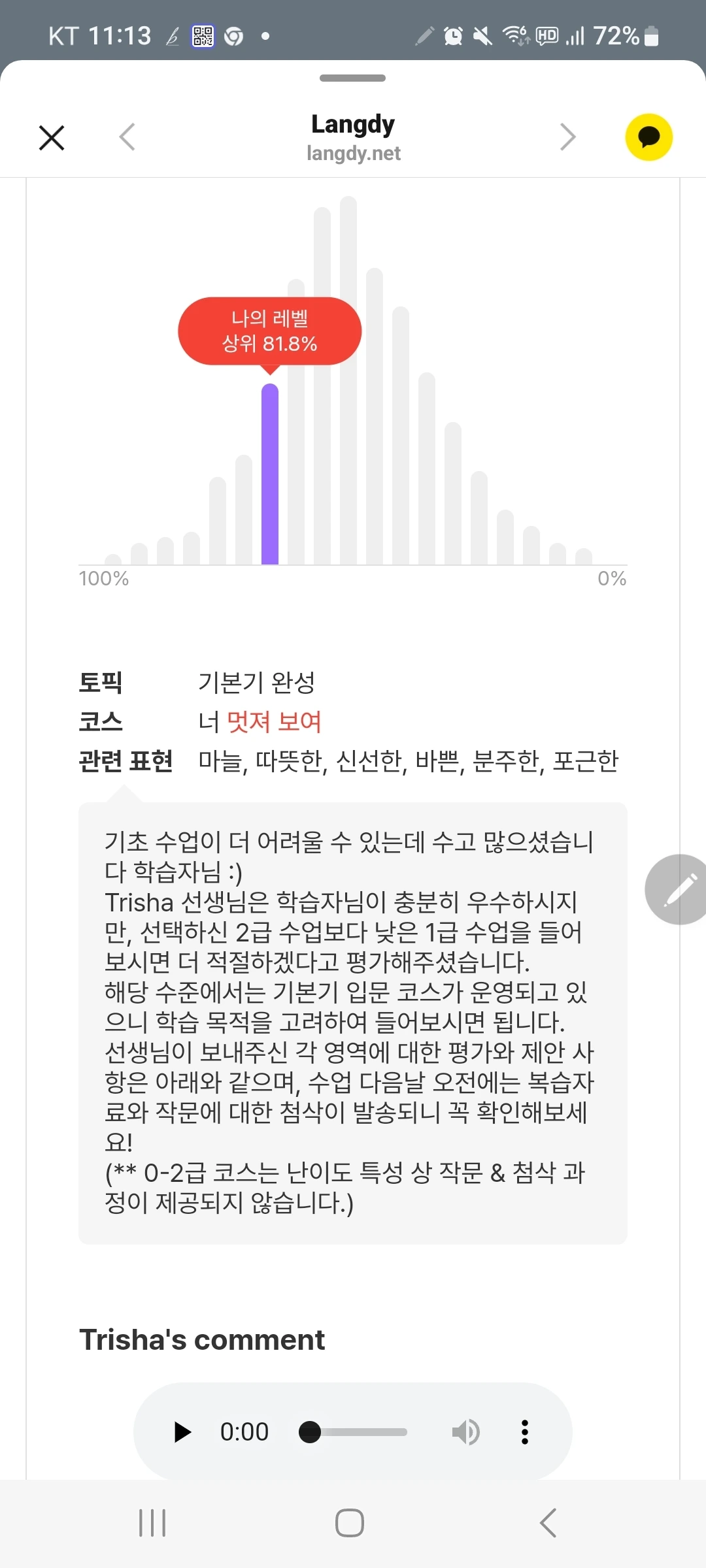열심히 대답하려고 애쓰는 학습태도가 좋다고 나와있다. 아래에 있는 피드백에 그래프상으로는 상위 81.8%로 나오는데 레벨 2에서 레벨 1로 신청하라는 의미는 뭘까?사실 상위 81.8%는 말도 안 된다.