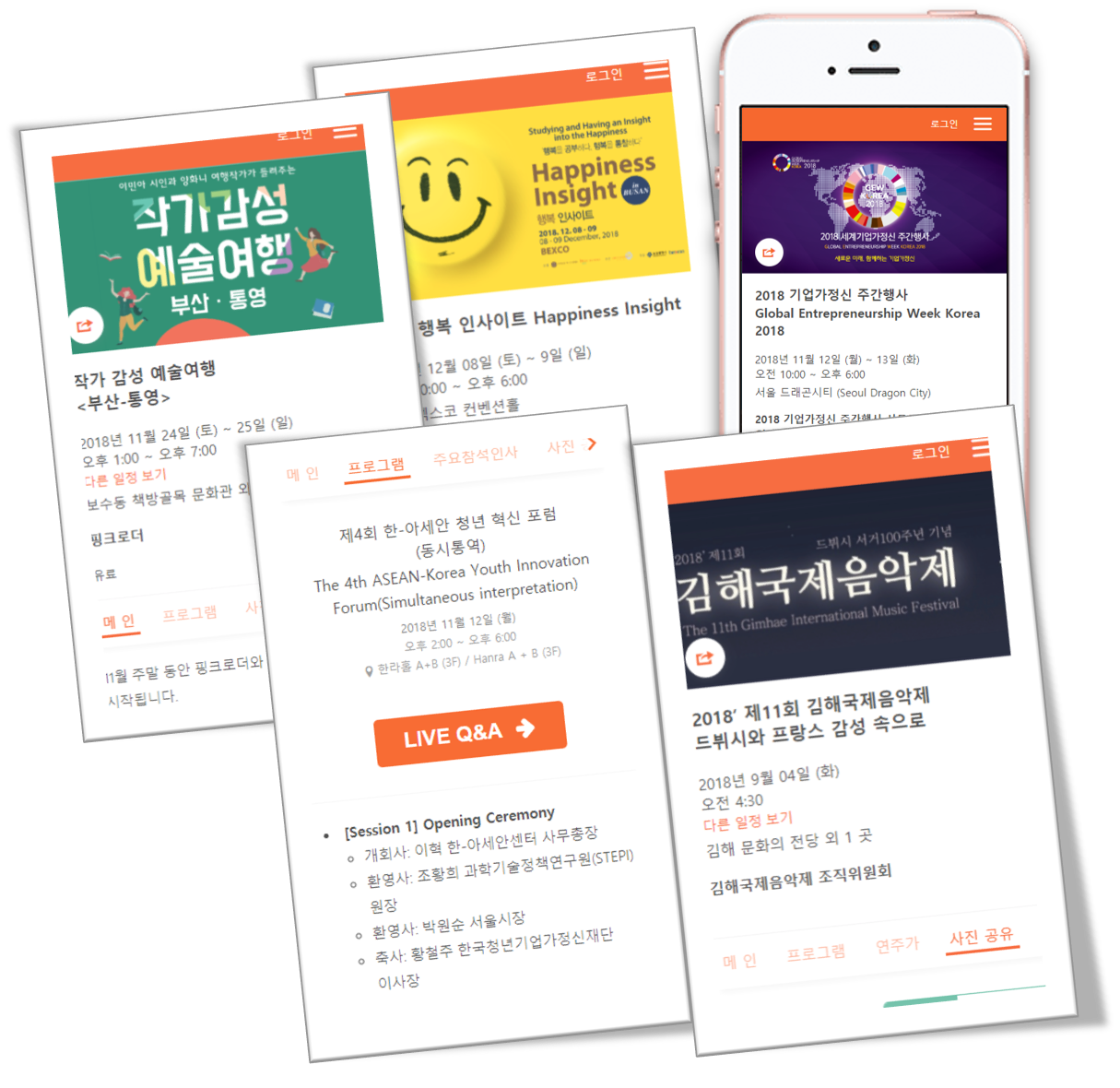 카카오톡, 페이스북 등 행사 홈페이지를 쉽게 공유할 수 있습니다.