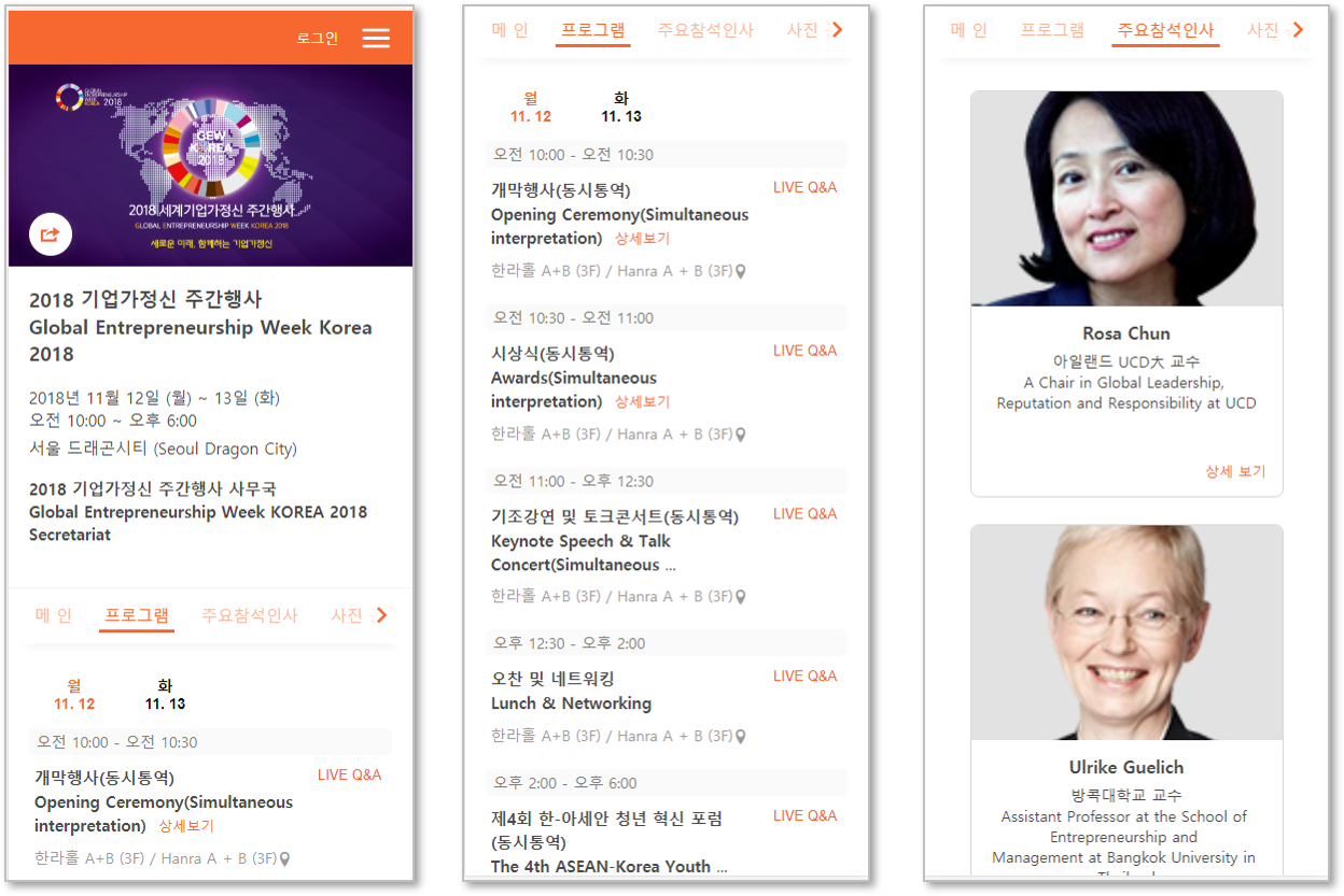 행사 프로그램, 출연진/연사 프로필, 부스/스폰스 업체 등의 행사상세내용을 모바일로 확인할 수 있습니다.