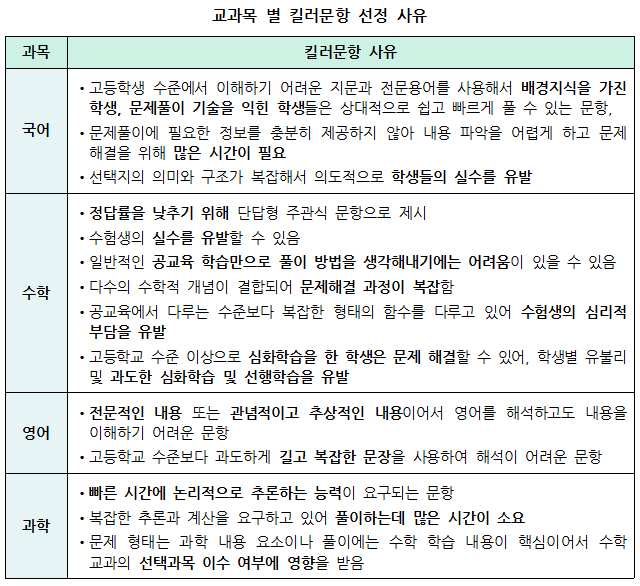 교육부는 킬러문항을 '공교육 과정에서 다루지 않는 내용으로 사교육에서 문제풀이 기술을 익히고 반복적으로 훈련한 학생들에게 유리한 문항'이라고 정의했습니다. 기존 수능시험과 이번 6월 모의평가 국‧영‧수‧과 480 문항을 검토하여 킬러문항 예시를 제시했습니다. 아래 표에 교육부가 킬러문항을 선정한 사유를 정리했습니다.