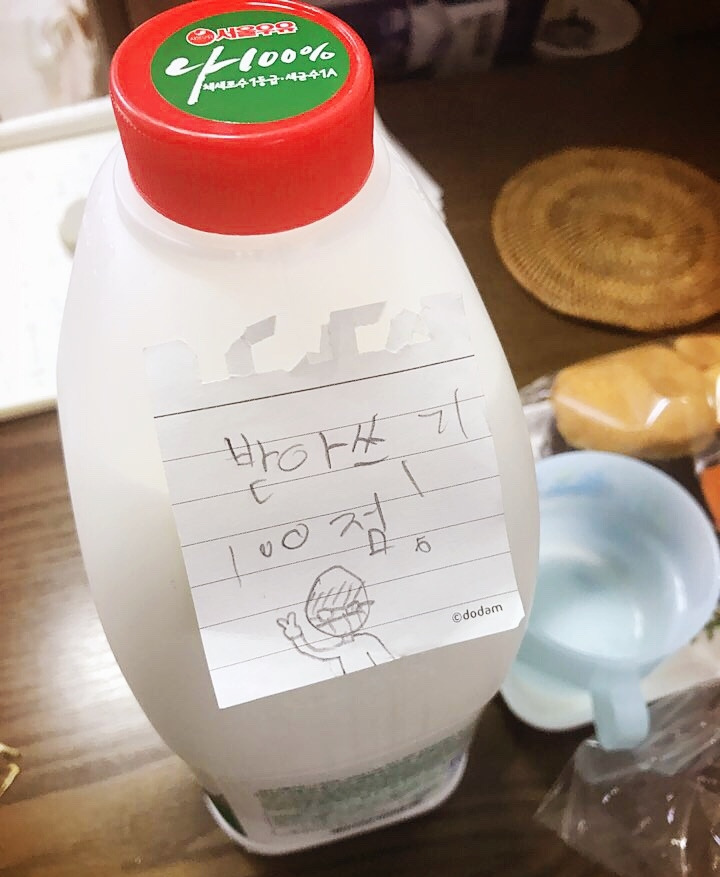 초등학교 때 받아쓰기 100점을 받고 간식으로 차려준 우유에 편지를 쓴 아들입니다. 이 기분 다시 느낄 수 있어 좋았습니다.