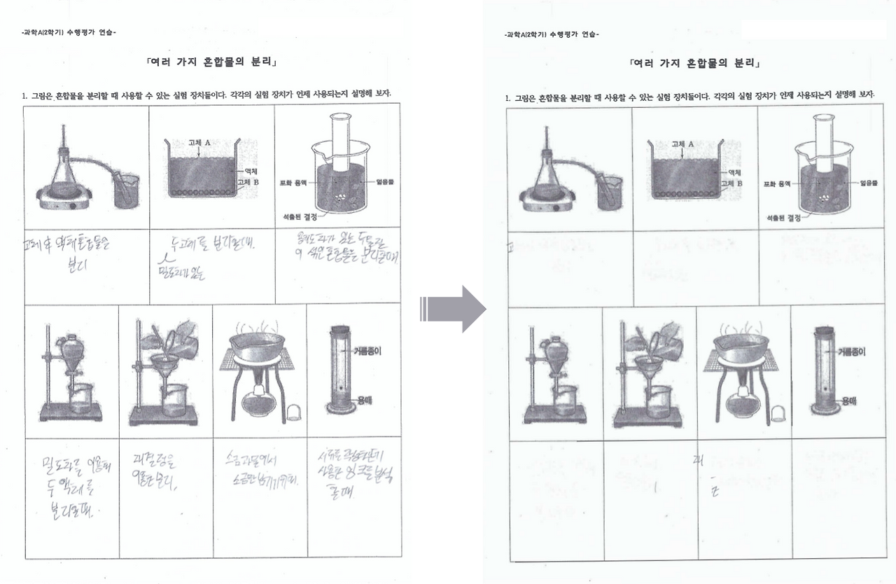 과학 수행평가는 선생님께서 평가할 내용을 수업 시간에 학습지로 연습시켜 주셨습니다. 이제는 교과서는 잠시 내려놓고 수행평가 연습 학습지를 공백으로 만들어서 반복적으로 연습했습니다.