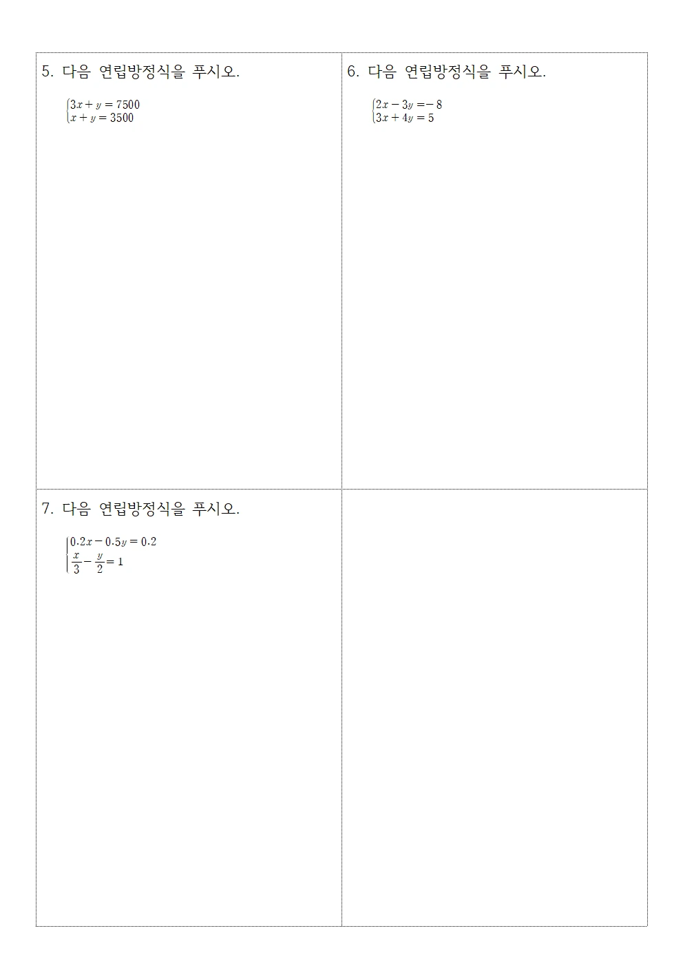 교과서에서 개념 부분은 제외하고 문제가 있는 페이지만 복사했습니다. 수학 수행평가는 시험 보는 날까지 두 번 이상 반복해서 풀 수 있는 분량을 날마다 풀도록 하였습니다. 대략 3문제 정도 되었던 것으로 기억합니다. 공부를 한꺼번에 많이 하면 체할 수 있으니 저희 아들은 날마다 부담 없도록 조금씩 하되 같은 문제를 반복해서 풀도록 유도했습니다. 수행평가일 직전에는 집에서 모의 평가를 실시했습니다. 제가 범위 내의 문제 중 7 문제씩 뽑은 유형 3개의 문제지를 만들었습니다. 학교에서 실제 평가하는 것과 최대한 유사하게 집에서 연습하고 감으로써 학교에서 좀 더 좋은 성적을 받았으면 하는 마음에서 이렇게 했습니다.
