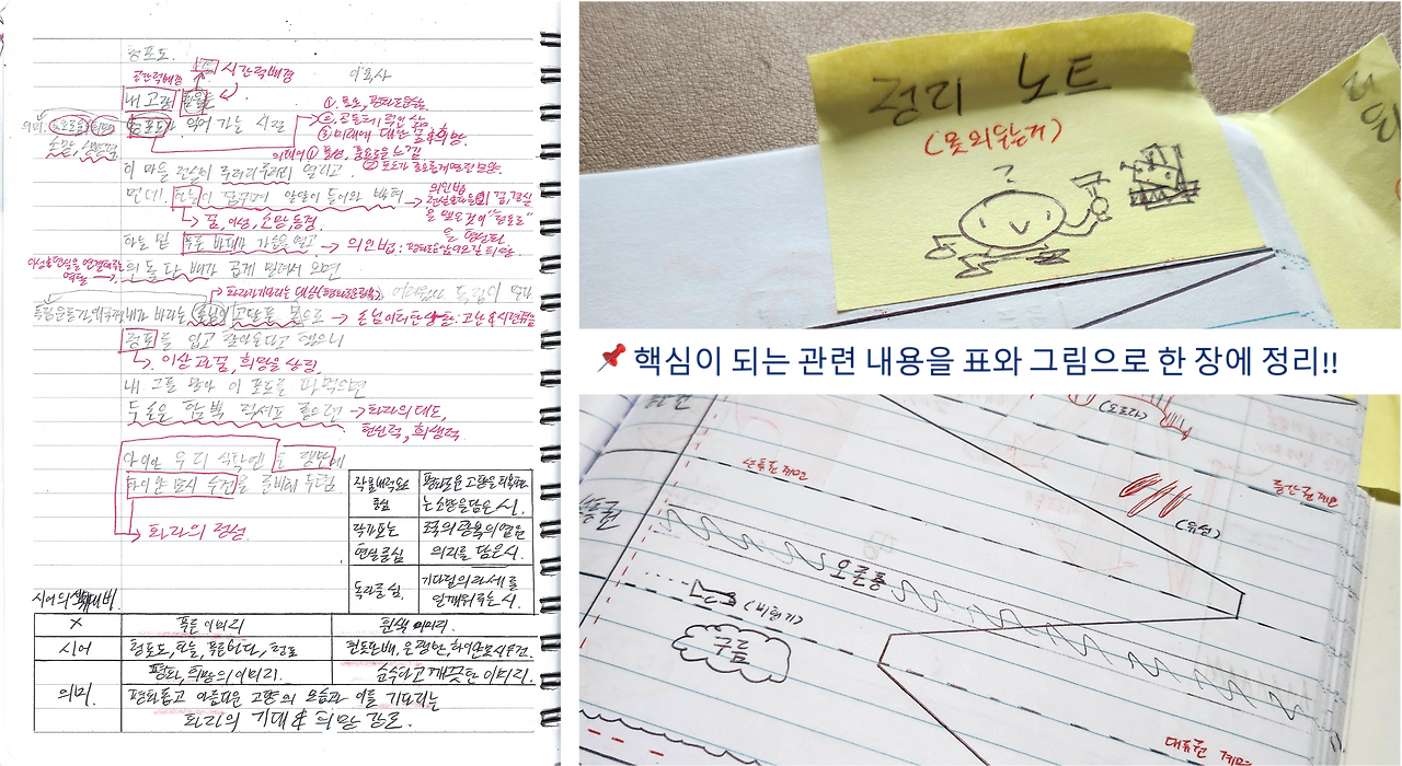 아들은 시험에 대비해 잘 안 외워지는 부분을 따로 정리했습니다. 처음에는 무엇을 어떻게 정리할지 몰라하던 아이가 이번 기말고사 때는 정리를 잘하더군요. 나름 핵심이 되는 내용을 표와 그림으로 도식화해서 시각적으로 정리합니다. 요점정리도 오답노트처럼 관련 내용을 한 장에 정리하면 좋습니다. 그런데 요점정리하는 아들을 지켜보는 저는 조금 걱정이 되기도 하더군요. 문제 풀기와 암기보다는 요점정리에 더 공을 들이는 듯해서요. 정리만 해 놓고, 외우지 않을까 걱정이 되더군요.