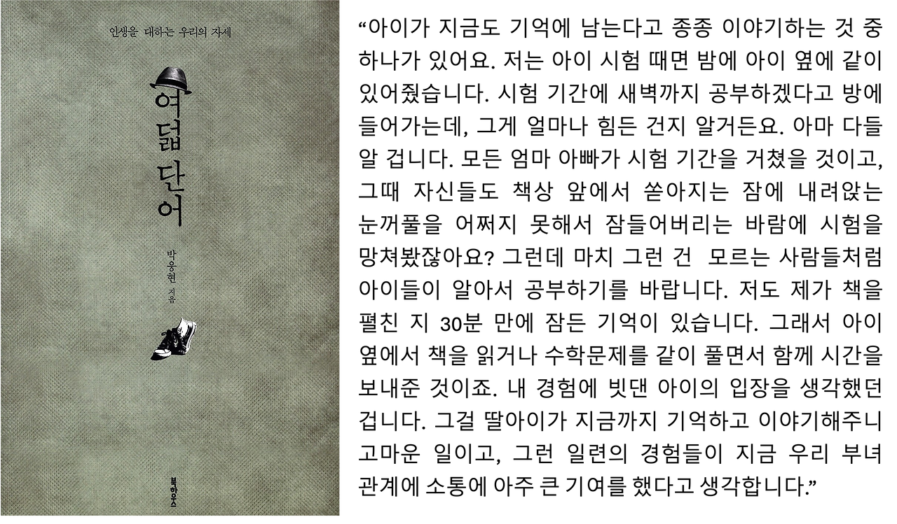 아들이 시험공부를 할 때 저도 무언가를 해야겠다는 생각이 든 것은 박웅현 작가의 「여덟 단어」 중 아래 내용을 보았을 때입니다. 작가는 딸 시험 기간에 자지 않고, 아이 옆에 있어줬다고 합니다. 저는 아들이 공부하는 동안에 같이 있어 주는 것에 금주까지 더해서 하기로 한 것입니다.