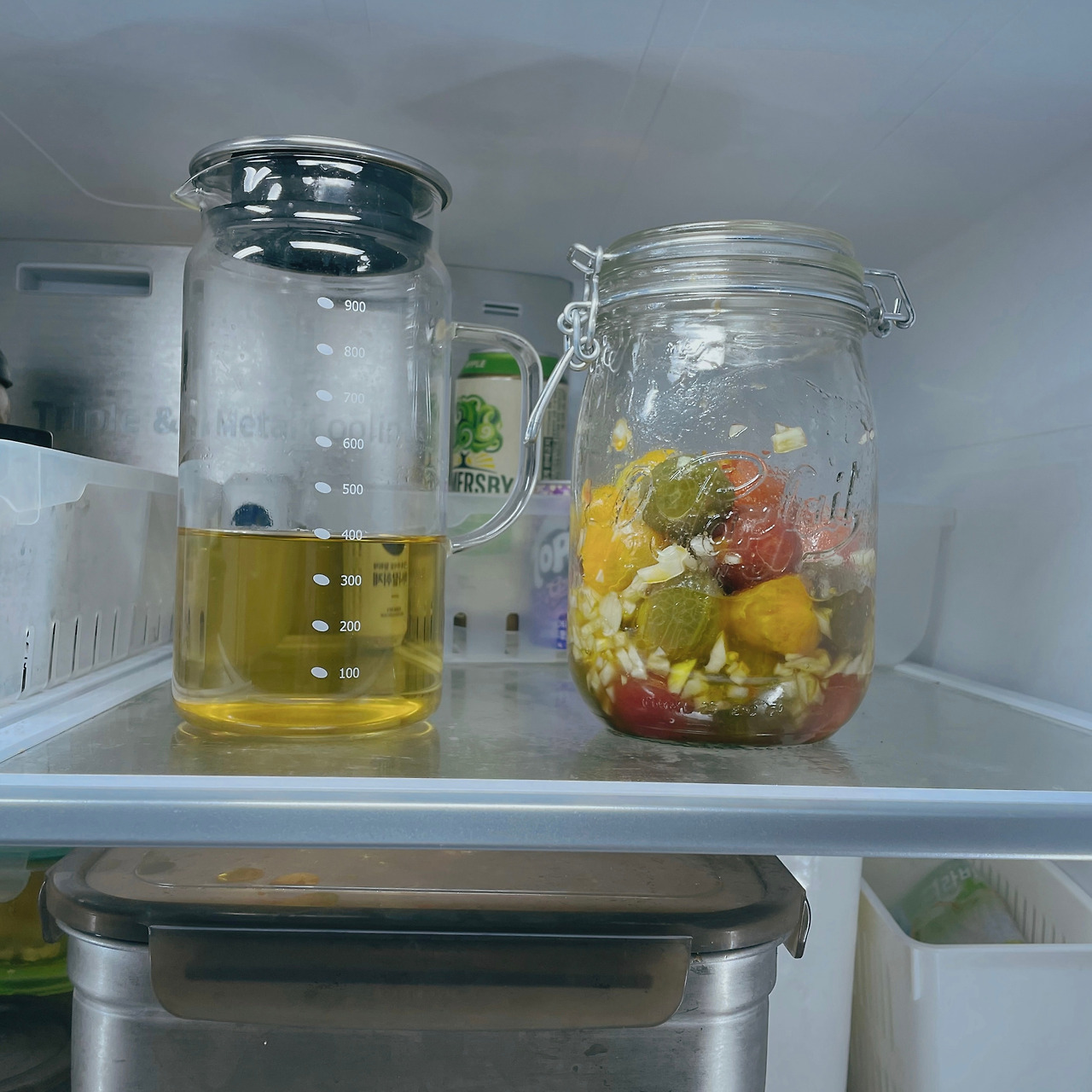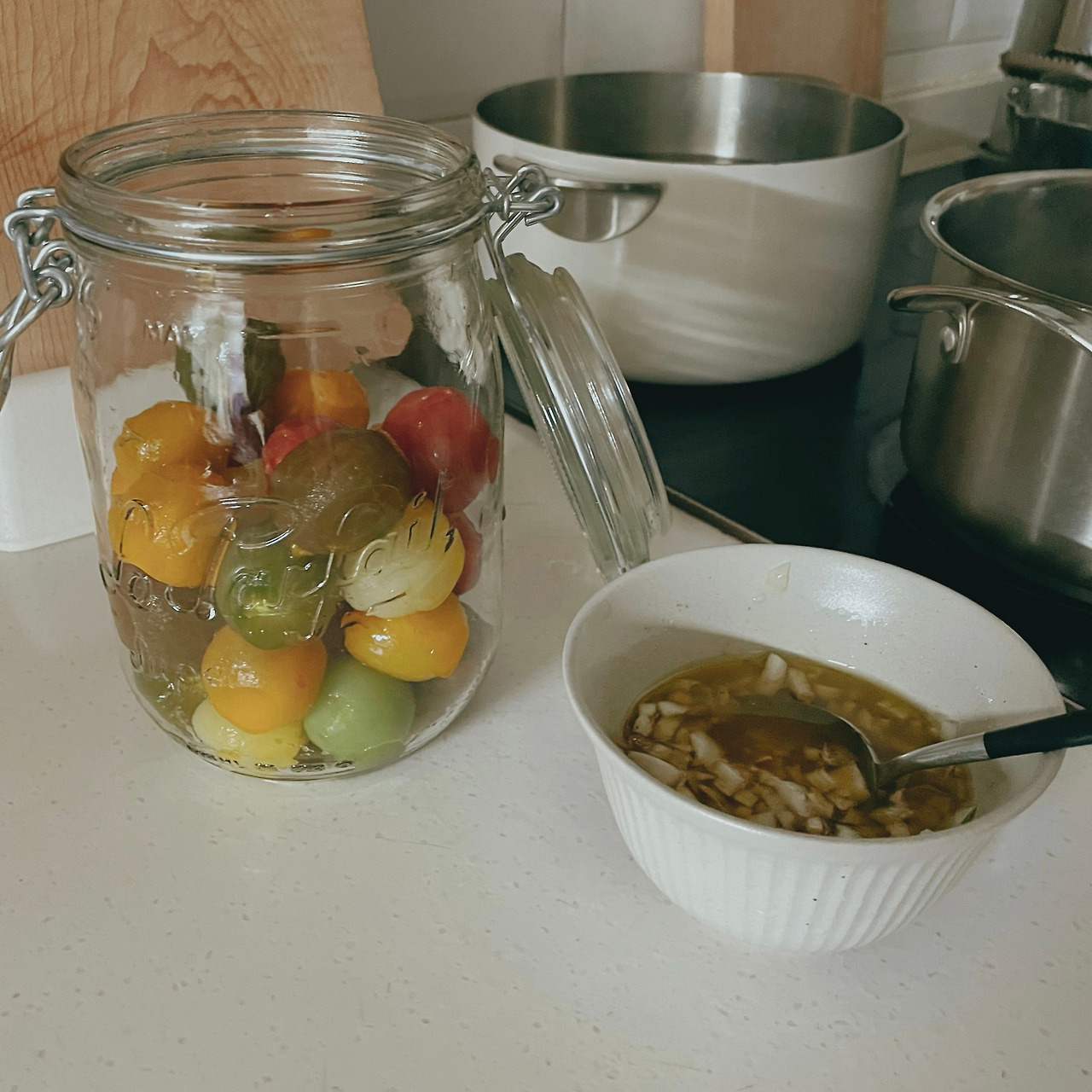 방울토마토는 껍질을 까서 유리병에 담고 그 위로 만들어 둔 소스를 붓는다. 그리고 조심조심 잘 섞어주면 끝이다.