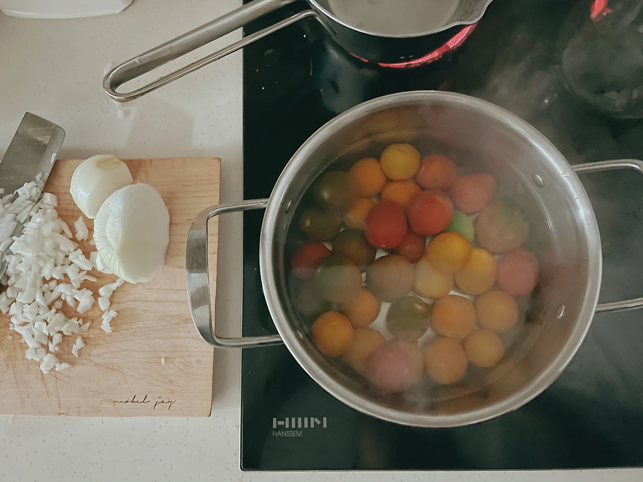 본격적으로 방울토마토 한 팩(500g)을 끓는 물에 살짝 데치고 양파 1/4개를 잘게 썬다. 토마토 껍질이 터지기 시작하면 꺼내서 찬물에 담가 놓는다. 그동안 소스를 만든다. 올리브오일 6큰술, 발사믹크림 1큰술, 소금 두 번 톡톡, 꿀 2큰술, 파슬리가루 0.5큰술, 잘게 썬 양파를 넣고 섞어주면 끝이다. (위의 비율은 개인적인 취향이므로 기호에 맞게 적절히 조절해 주세요.)