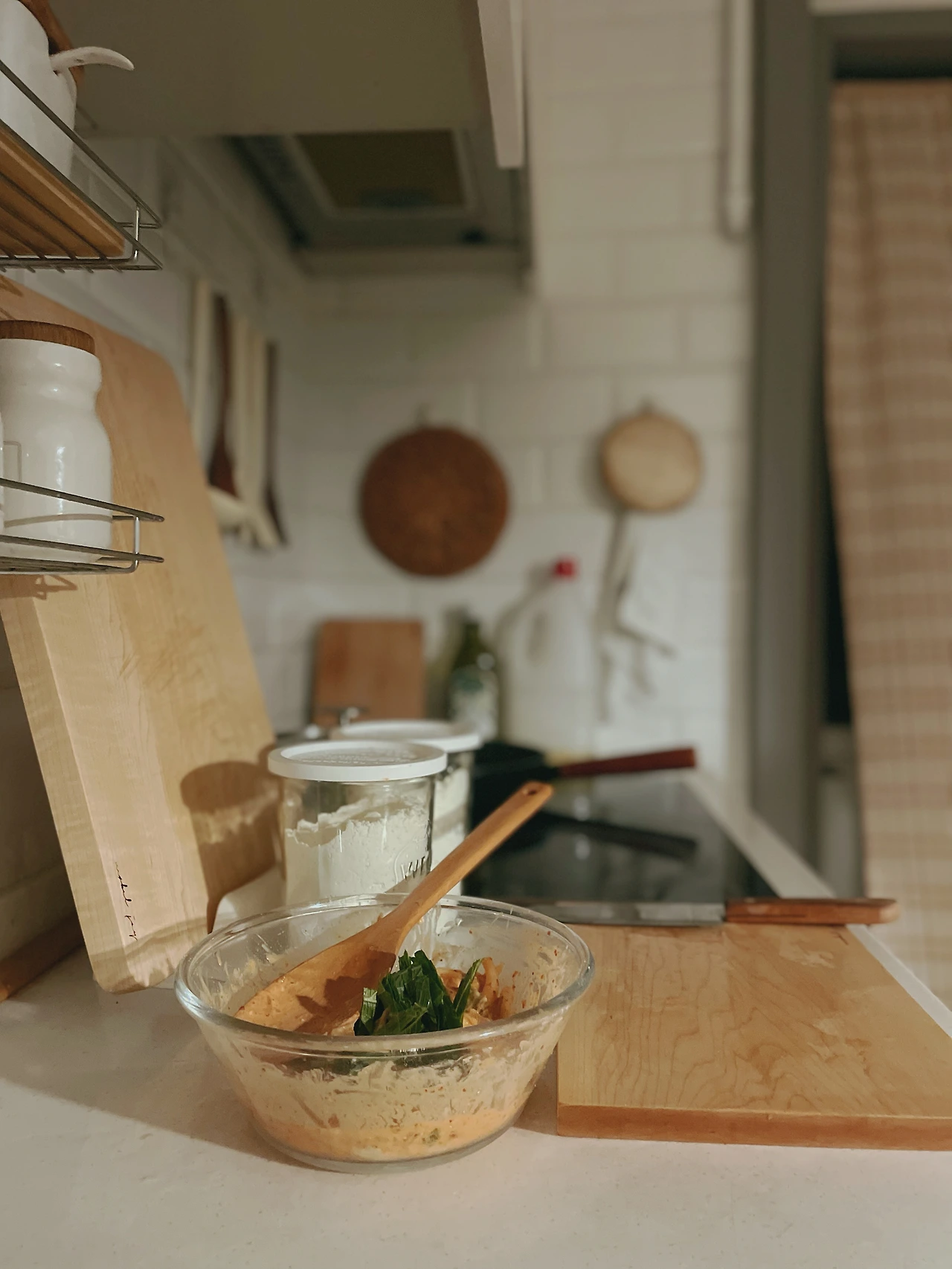 보통은 부침가루만 넣는데 더 바삭하게 먹고 싶을 때는 튀김가루도 넣어준다. 그리고 잘 익은 김치와 양파, 깻잎(이번에 처음 넣어 봤는데 괜찮았다!)을 넣고 잘 섞는다.