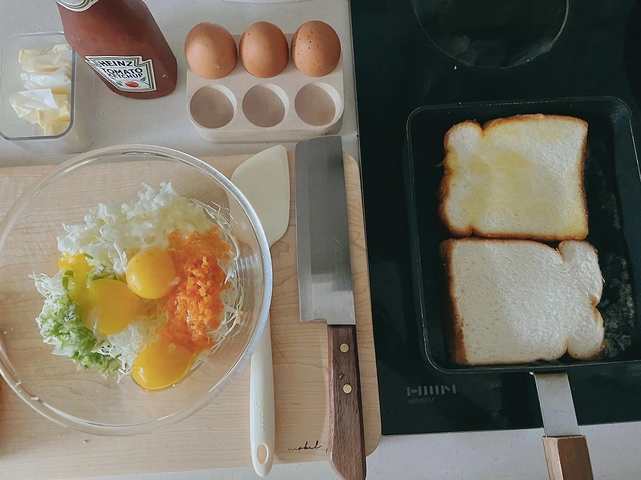 그 사이, 팬에 버터를 녹이고 식빵에 브라운 색감이 생기도록 굽는다.