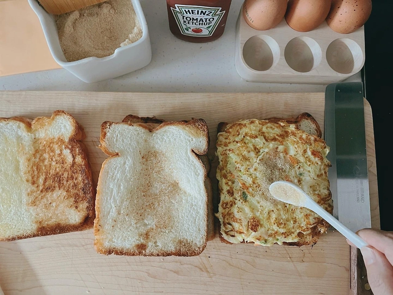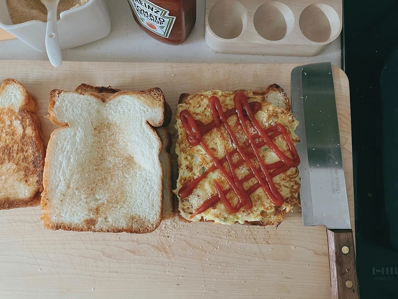그 위에 케첩을 지그재그로 뿌려서 나머지 식빵 한 장을 덮어 주면 완성이다.