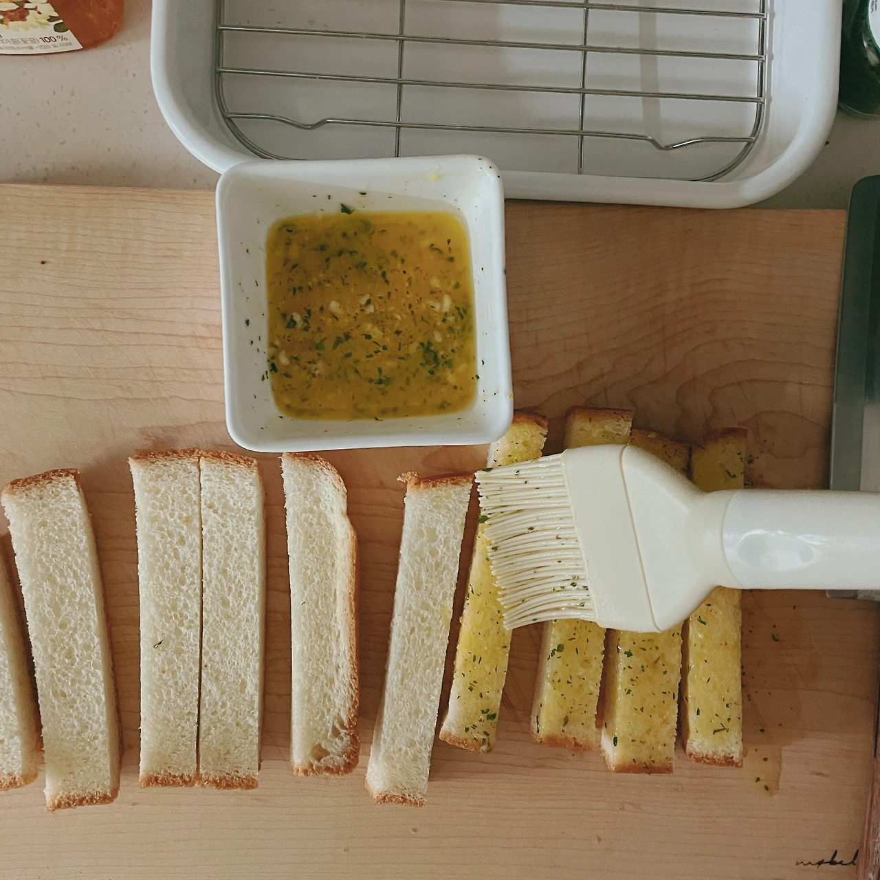 우선, 식빵을 길게 잘라주고 버터 갈릭 소스를 준비한다.