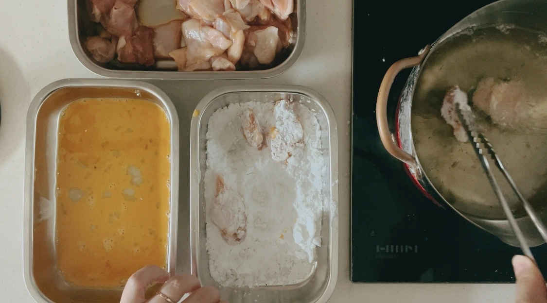 가라아게는 닭다리살로 만든다. 닭다리살에 밑간(맛술, 간장, 소금, 후추)을 한 후 30분 정도 냉장실에 넣어 둔다. 그리고 달걀물, 전분 순으로 묻혀 끓는 기름에 넣는다.