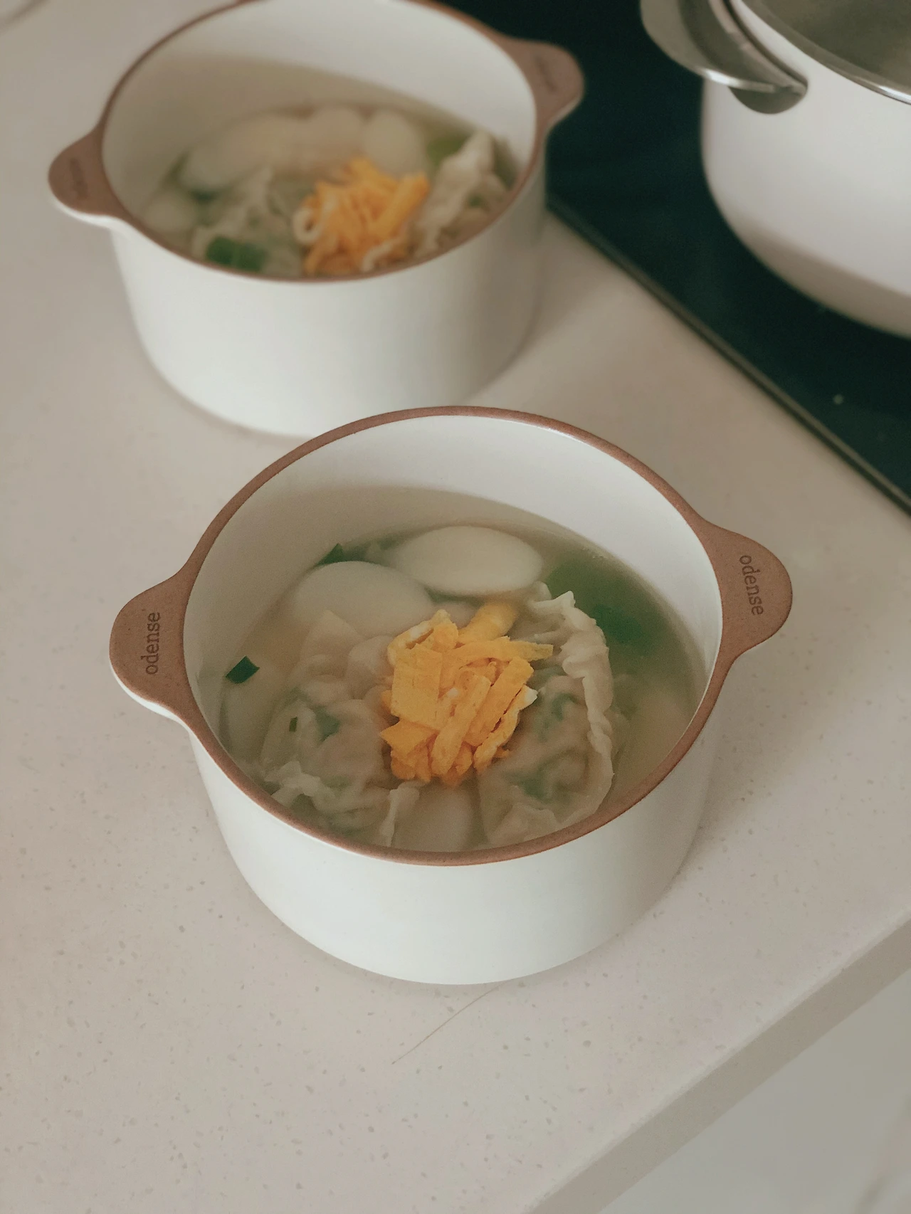 육수가 끓으면 만두부터 넣는다. 떡은 퍼지기 쉬워서 나중에 넣는 게 좋다. 마지막으로 후추 약간과 대파를 넣으면 완성이다. 예쁜 그릇에 담아 달걀 지단을 올려 준다.