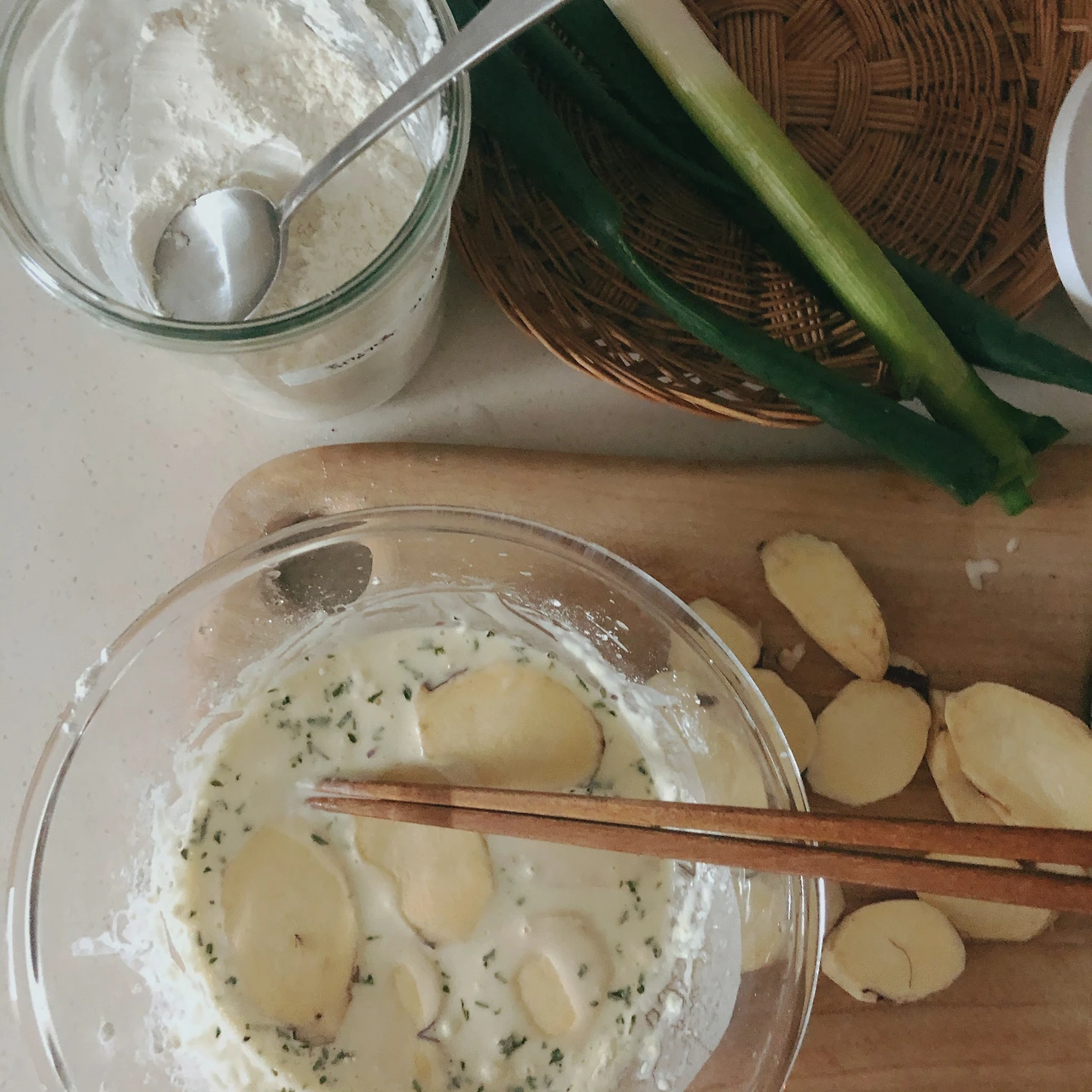 고구마는 껍질을 까고 어슷썰기 해서 준비한다. (두께가 약간 도톰해야 더 맛있다.) 집에서 튀김 한번 하려면 일이 커지는데 고구마튀김은 프라이팬에서 간단하게 조리할 수 있어서 좋다.
