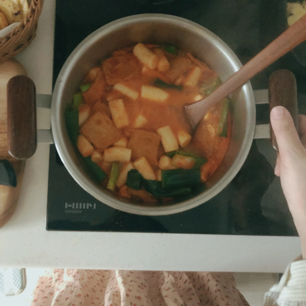 밀 키트로 준비한 떡볶이는 냄비에 넣고 휘리릭 끓여 낸다. 떡이 말랑말랑해졌을 때, 대파를 손가락 두 마디 크기로 썰어서 듬뿍 넣는다. 그리고 그릇에 담아 통깨를 뿌린다.