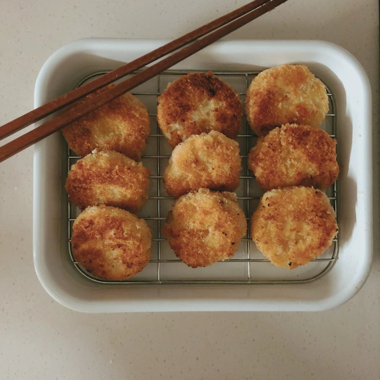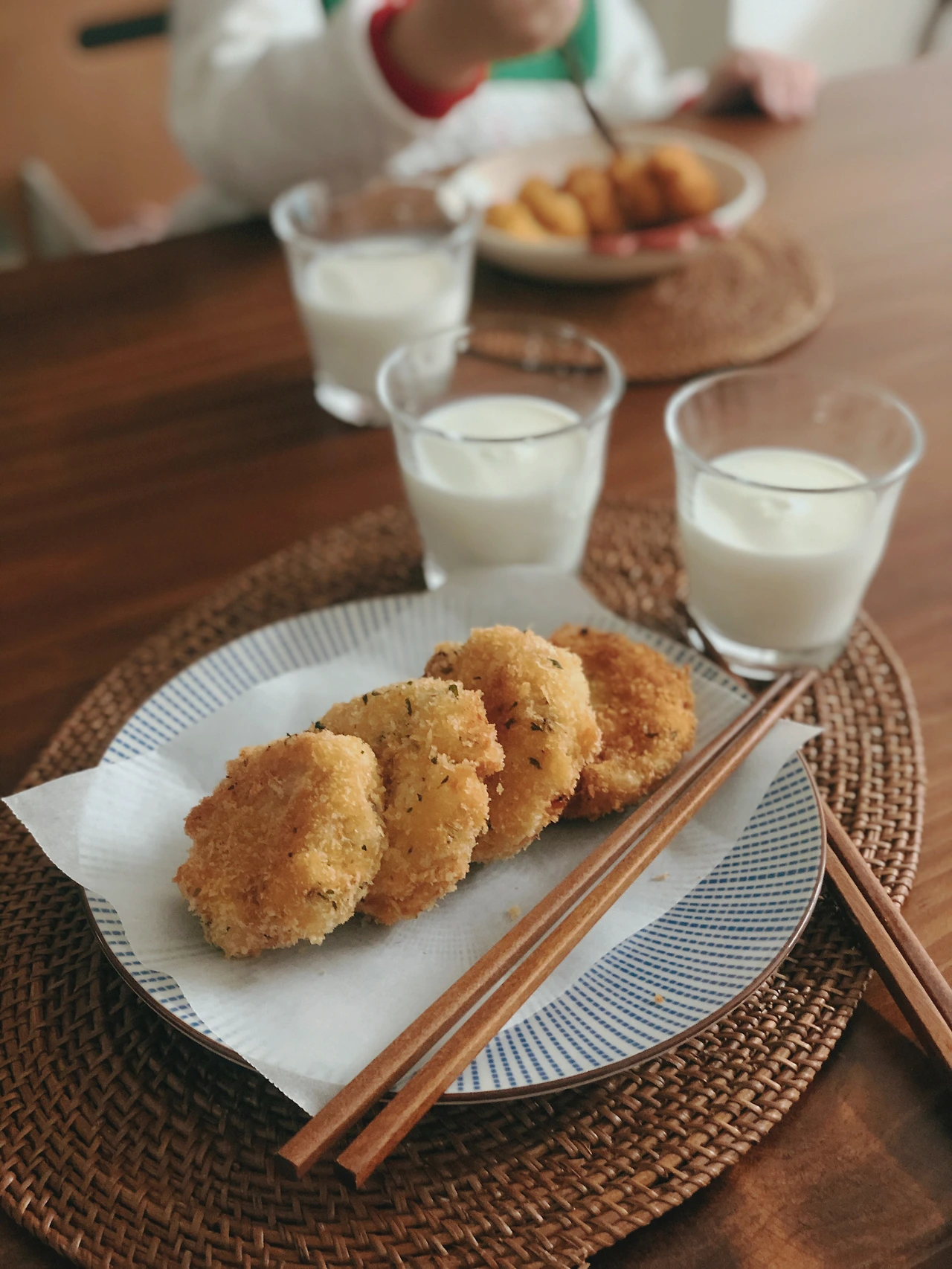식힌 크로켓을 접시에 담아낸다. 흰 우유 한 잔과 수제 크로켓으로 온 가족이 먹을 수 있는 훌륭한 영양 간식이 된다.