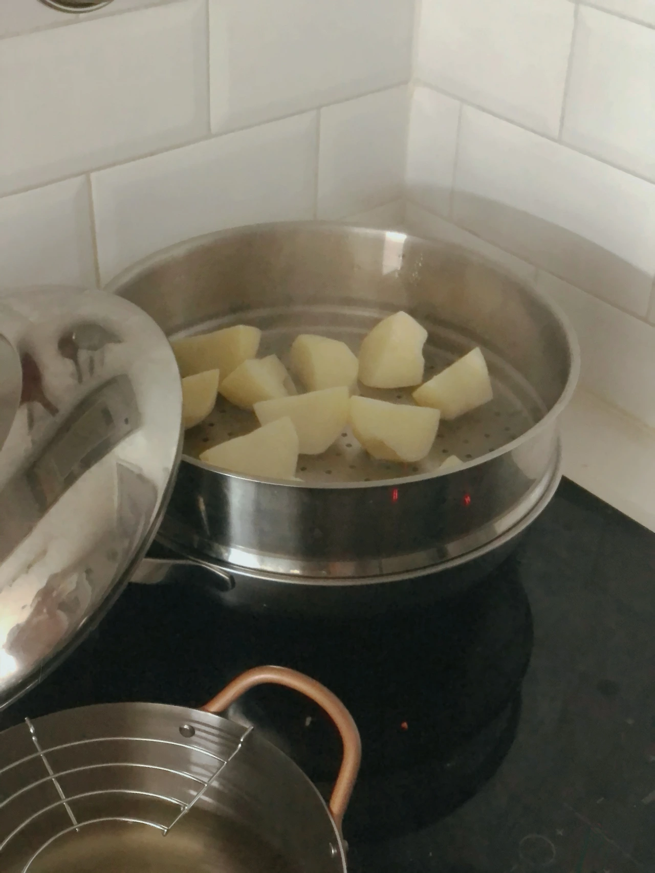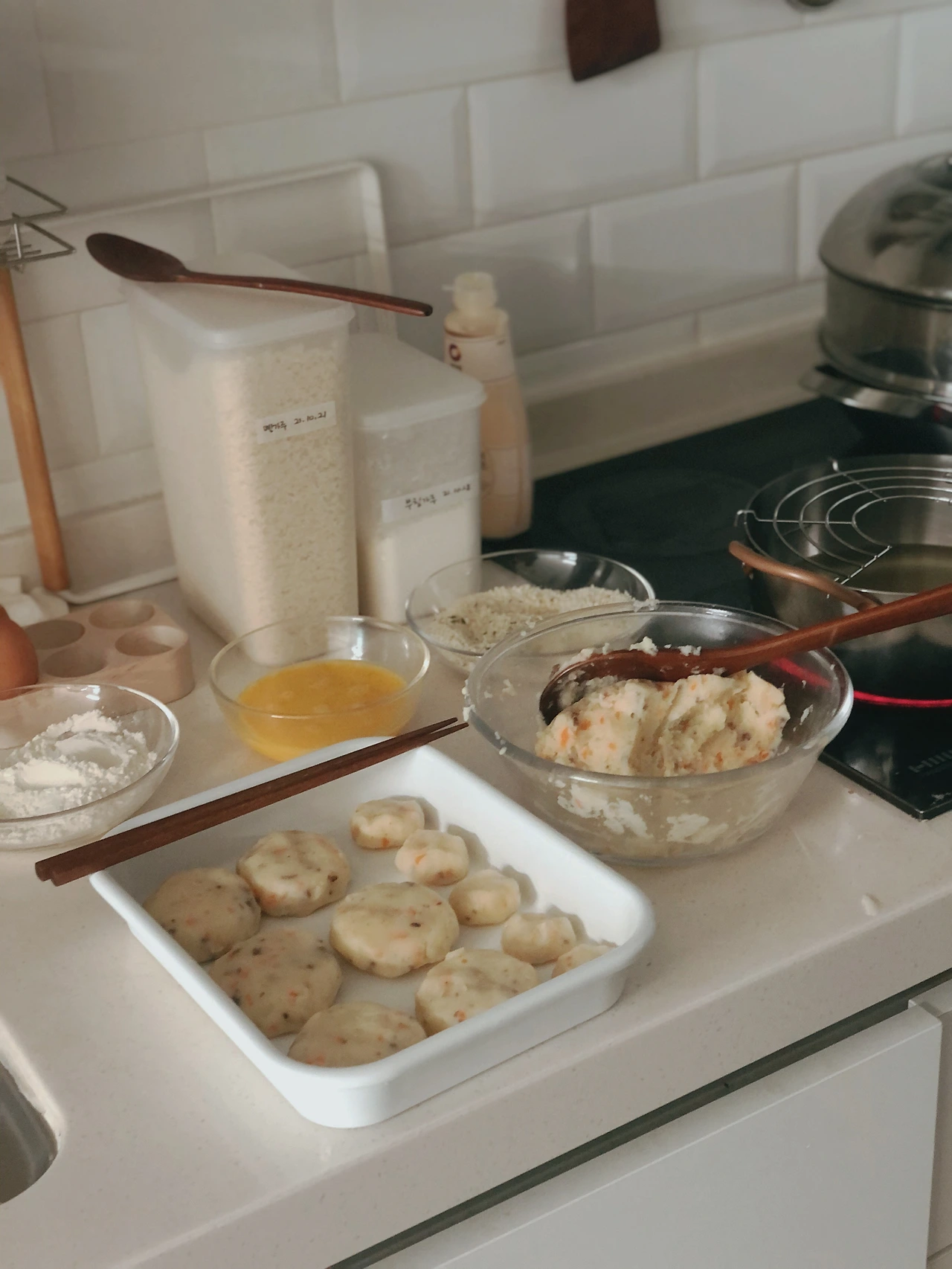 우선 감자 껍질을 깎고, 4 등분하여 찜기에 찐다. (4등분 하는 이유는 부피를 작게 해서 조금 더 빨리 익게 하기 위함이다.) 그리고 집에 있는 채소(양파, 당근, 애호박 등)와 햄(또는 볶은 소고기)은 모두 살짝 볶은 후에 잘게 다져서 찐 감자와 함께 버무린다. 이때, 마요네즈를 3, 4바퀴 크게 돌려서 넣고 후추로 간을 한다. 마요네즈가 들어가서 뭉치기 쉬운 반죽이 된다.