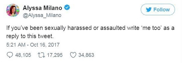 2017년 중순쯤 와인스틴과 그 피해자들을 다룬 뉴스가 터지고난 며칠 후, 여배우 알리사 밀라노는 여성들에게 각자가 당한 성희롱과 성폭력 이야기를 자신의 트윗에 Me Too라는 메시지를 달아 같이 공유하자고 했다. 그 결과 48시간 만에 미투 해시태그를 단 트윗이 100만에 가까워졌다. 그렇게 미투 운동은 인터넷을 통해 물결처럼 전 세계를 휩쓸었고 머나먼 우리나라까지 확산됐다.