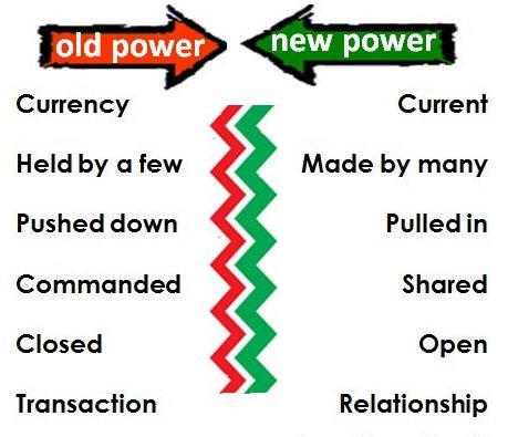 구권력이란 우리가 흔히 생각되는 권력, 즉 폐쇄적이고 지도자 주도형이며 상명하달 방식으로 동작하는 권력을 말한다. 이 권력을 손에 넣은 자는 절대 놓지 않으려 하고 소수만이 이 힘을 지니고 있다. 하지만 신권력은 전혀 다르다. 신권력은 개방적이고 참여적이며 다수가 주도하는 방식으로 동작한다. 권력이 한 곳에 고여있는 게 아니라 강물처럼 일정한 방향으로 흐르도록 한다.