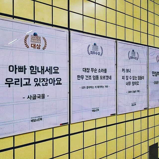 지하철 환승구간이나 광역버스 광고판에서 위 사진처럼 배민신춘문예 수상작품들을 흔치 않게 볼 수 있다. 올해엔 무려 약 25만 개의 작품이 응모되었다니 그 인기가 어느 정도였는지 대충 짐작할 수 있다.