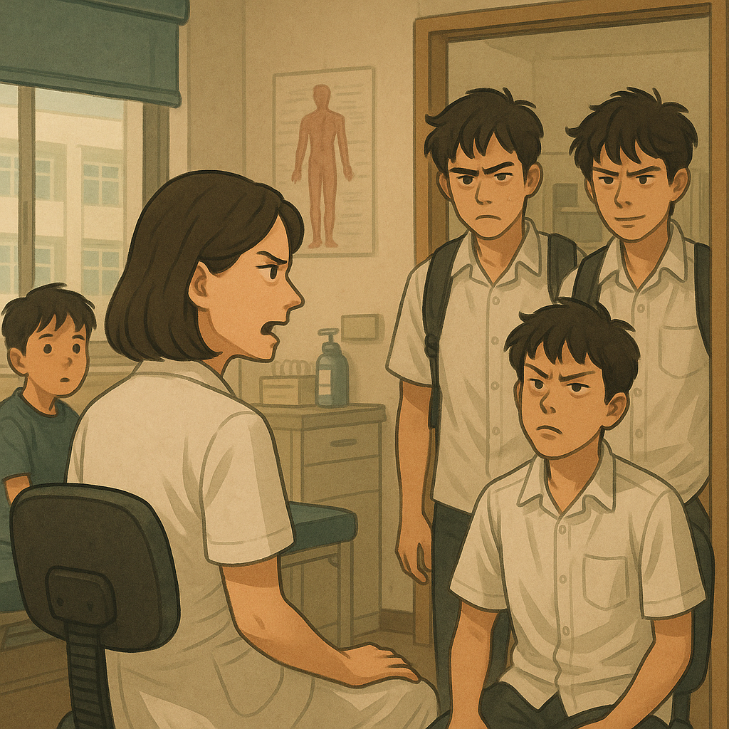 그 일이 있고 난 후, 점심시간 종료 5분 전. 그 무리의 아이들이 다시 보건실로 몰려들었다.