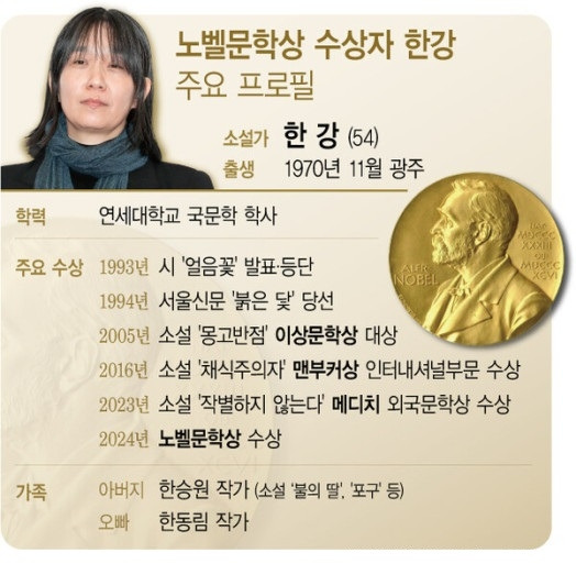 오늘의 노벨문학상은, 아니 오늘의 한강 작가는 없었을 겁니다. 1993년 '문학과 사회' 겨울호에서 서울의 겨울 시로 등단한 작가는 1994년 서울신문 신춘문예에 '붉은 닻'이 당선되며, 소설가로 첫발을 내디뎠습니다. 2005년 몽고반점으로 이상문학상을, 2016년 '채식주의자'로 맨부커상 국제수상자로 영예를 안았습니다. 지난해에는 '작별하지 않는다'로 프랑스 메디치외국문학상에 이어 올해 노벨문학상까지 전 세계 곳곳에 대한민국 문학 르네상스를 이끌었습니다. 아시아 여성 가운데 처음으로 노벨문학상을 받았습니다. 역사적 트라우마를 직시하고 인간 삶의 연약함을 드러내는 강렬한 시적 산문을 선보였다는 노벨위원회 평가처럼 그녀는 중력을 거스르는 신념으로 한 발짝 한 발짝씩 앞으로 나아가고 있었습니다.