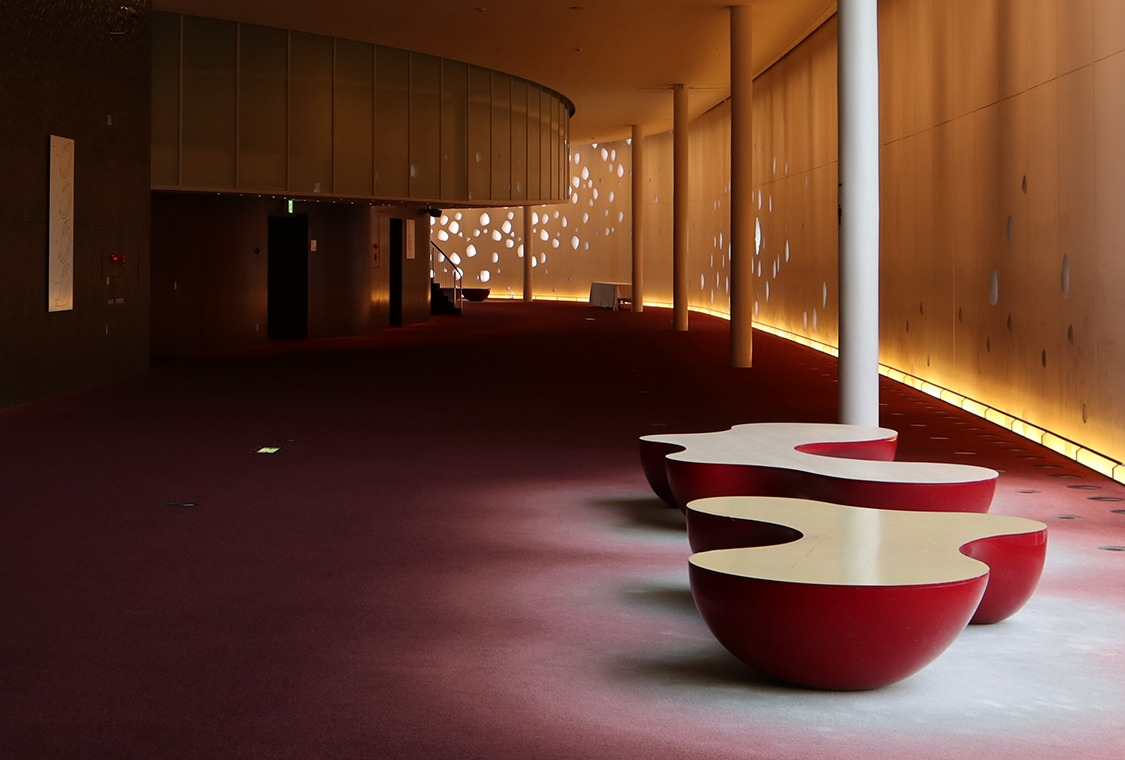 토요 이토는 마츠모토 공연예술센터에 대한 인터뷰에서 공연이 무대 밖 공간을 거쳐 도시까지 확장되는 것을 의도했다고 밝혔습니다. 조명, 마감재 그리고 가구는 무대장치와 같이 정교하게 디자인되었습니다.