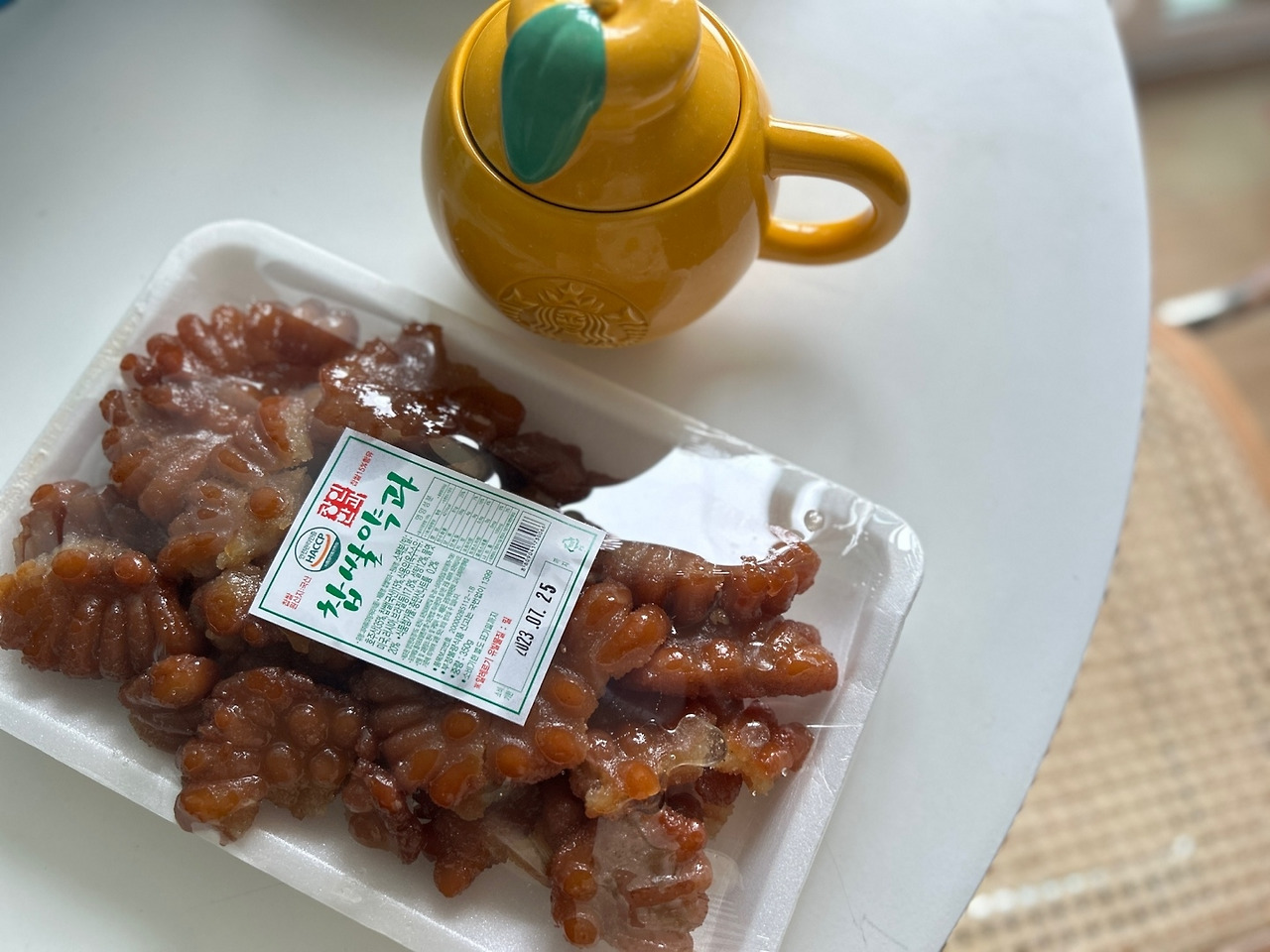 궁금함에 참을 수 없어서 약과 한 팩을 차 안에서 뜯었습니다. 계피 향 솔솔, 달달한 집청의 향이 비닐을 뜯자마자 뭉근하게 풍깁니다. 일반 미니약과보다 검붉은 색감에 청이 충분히 스며들어 표면은 에나멜 구두처럼 반질반질하게 식욕을 잔뜩 돋우는 모양새입니다. 한입 베어 먹으면 느껴지는 이 쫄깃한 식감! 조청과 찹쌀의 찐득한 만남이 선사하는 환상의 콜라보! 입 안엔 흡사 단감을 먹을 때 느껴지는 그 아련하고 은은한 단맛이 꽉꽉 들어찹니다. 아메리카노와 먹으니 몇 개를 먹어도 단 맛에 질리지 않았습니다. 딱딱하지 않고 쫀득쫀득하게 입안을 감싸는 달콤함에 계속 당깁니다. 확실히 이 맛은 일반 떡집에서 먹는 약과보다 맛있었습니다. 큰일입니다, 남편과 나는 딸내미 주겠다고 산 약과 한 팩을 벌써 절반이나 먹어버렸습니다.