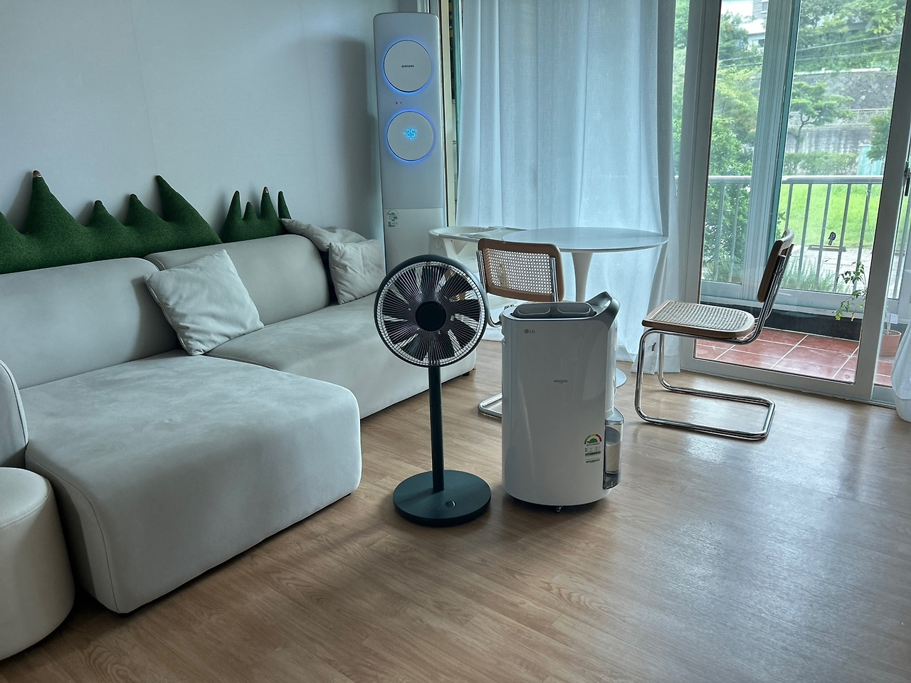 우리 집 안방 샤넬 자매님들과 루이뷔통 형제님들을 지키기 위해 특단의 대책이 필요했습니다. 이때 필요한 건 최신형 습도방어체계! 바로 구축에 돌입합니다. 제습기(62만 9천 원), 덩달아 신형 선풍기(11만 9천 원)도 든든하게 업어왔습니다. 제습기 시범운전을 해보니 기존 실내습도가 70%에서 50%으로 떨어지며 순식간에 공기가 뽀송해집니다. 집 전체는 커버가 힘들지 몰라도 방 한 칸 정도는 쾌적함을 유지하기에 든든합니다. 온도계 빵긋 웃습니다.