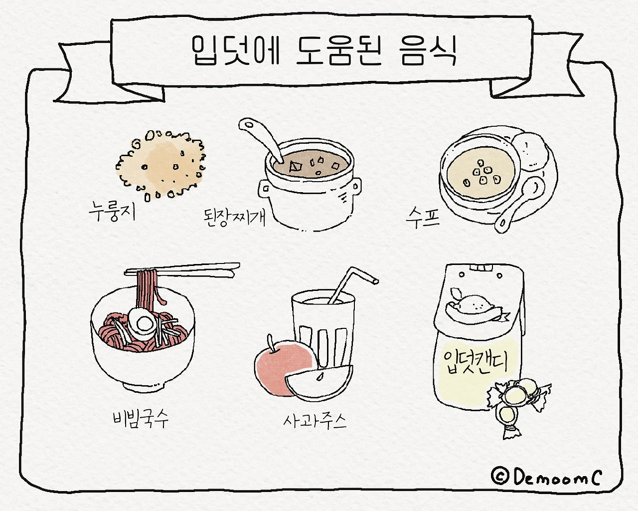 ‘누룽지’, ‘된장찌개’, ‘수프’, ‘비빔면’, ‘사과주스’, ‘입덧캔디’.