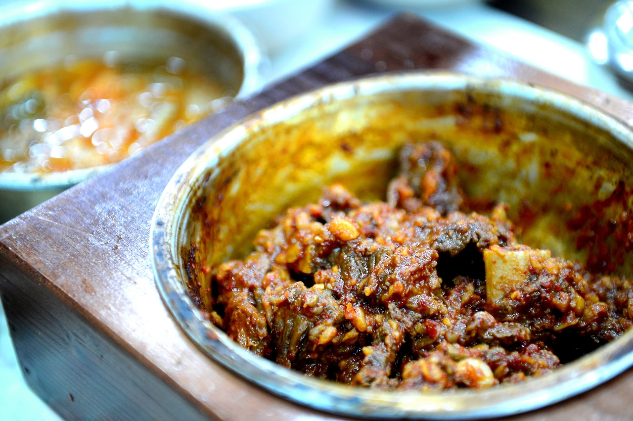 ◊‘백문이 불여일식’ 진고개 갈비찜=서울의 옛 지명인 진고개는 선비들이 살던 남산골을 부르던 지명이다. 비만 오면 진흙탕이 지는 고개라 진고개(泥峴)다. 내외국인에게 유명한 충무로 진고개(珍古介)도 근처에 있다.1963년 문을 열어 60년 가까이 영업 중인 노포 진고개는 어복쟁반과 게장 등 다른 메뉴도 알려졌지만 갈비 찜정식을 파는 보기드문 집이다.1인분에 한 냄비씩 제공하는 갈비찜은 얼핏 봐도 푸짐하다. 달큰하면서도 진한 간장 맛에 한약재 향까지 살짝 난다. 갈비찜은 삼계탕처럼 보양식 개념이니 약재 향이 오히려 느끼함을 걷어내준다. 서양의 스튜와 비견되는 갈비찜은 원래 전통 궁중요리로 대추와 황기, 생율 등 다양한 약재를 넣고 오해 쪄서 육질을 부드럽게 해서 먹는다. 달달하지만 딱 거슬리지 않을 만큼이다. 오래 조려내 보들보들 결대로 찢어지며 고소한 맛을 남긴다. 갈빗뼈에 바로 붙어있는 콜라겐 성분 막까지 부드럽다. 서울 중구 충무로 19-1 1만9000원.