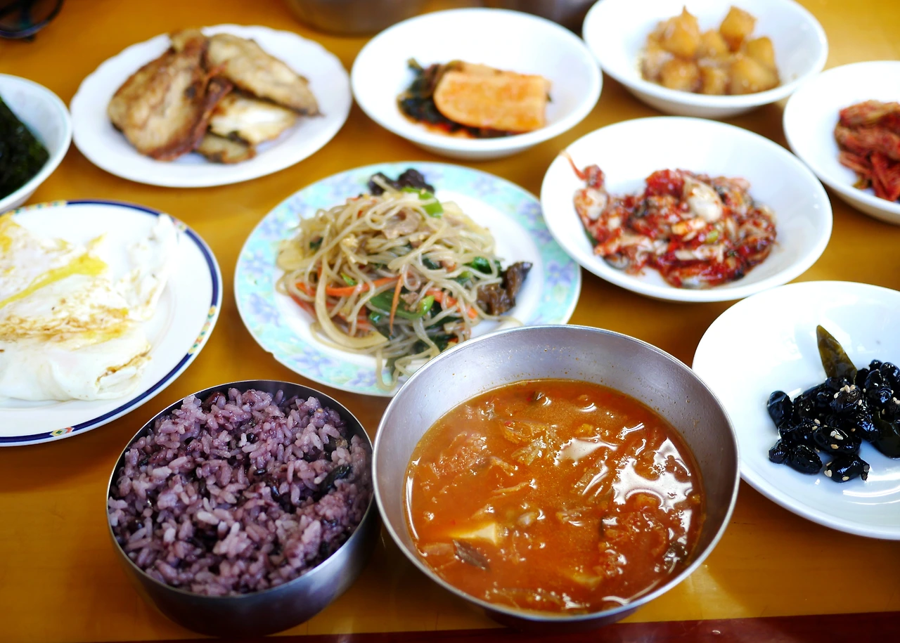 한식 상차림은 기본인 밥과 국(또는 찌개), 그리고 반찬이 깔린다. 반찬의 기본은 김치다. 김치도 여러 종류를 낸다. 동치미(물김치)와 익은 김치, 겉절이 등을 내고 갓김치나 파김치 등 김치만 7∼8종 차리는 곳도 있다.