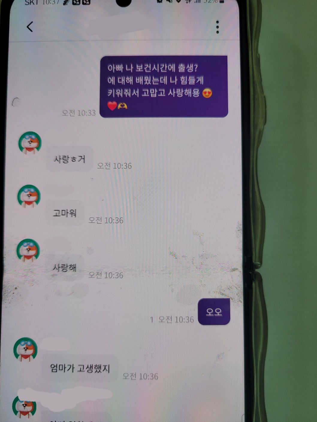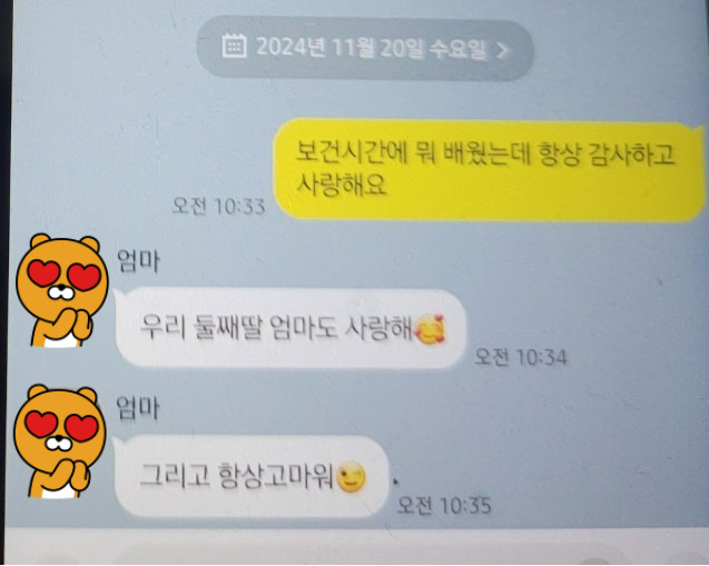 -지금부터 핸드폰을 꺼내 나를 키워 준 양육자분들에게 감사의 메시지를 보내봅시다. 메시지를 보낸 후 답장이 온 학생 선착순 여섯 명만 하리보젤리 주겠습니다. 참 보호자에게 보건수업시간이라고꼭 말하세요. 저번에 한 학생이 보호자에게 사랑한다고 메시지를 보냈었습니다. 보호자가 직장에서 일하다가 평상시 사랑한다는 말을 안 하는 아이가 사랑한다고 메시지를 보내니 깜짝 놀라 아이에게 전화를 했습니다. 그런데 체육시간이라 아이가 전화를 안 받자 담임선생님에게 무슨 큰일이 난 건 아닌가 싶어 전화를 했고 체육시간이라 담임도 전화를 받지 못했다. 보호자는 결국에 교감실에 전화하여 자기 자녀반에 무슨 일 있냐며 담임도 아이도 전화를 받지 않는다고 걱정한 일이 있었습니다. 여러분이 갑자기 사랑한다고 메시지를 보내면 보호자가 깜짝 놀랄 수 있습니다. 메시지를 보낼 때는 보건수업시간에 출생과정에 대해 배웠다는 말을 꼭 넣고 감사함이나 사랑함을 표현하세요.