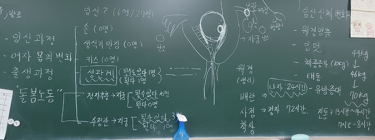 '어떻게 하면 임신이 될까?, 아이는 어떻게 태어날까?'라는 궁금증을 해결해 보자고 했을 때 학생들은 웃기도 하고 쑥스러운 모습을 보이기도 했다. 보호자에게 이런 질문을 했던 경험이 있는 학생은 반마다 평균 6명 정도였다.