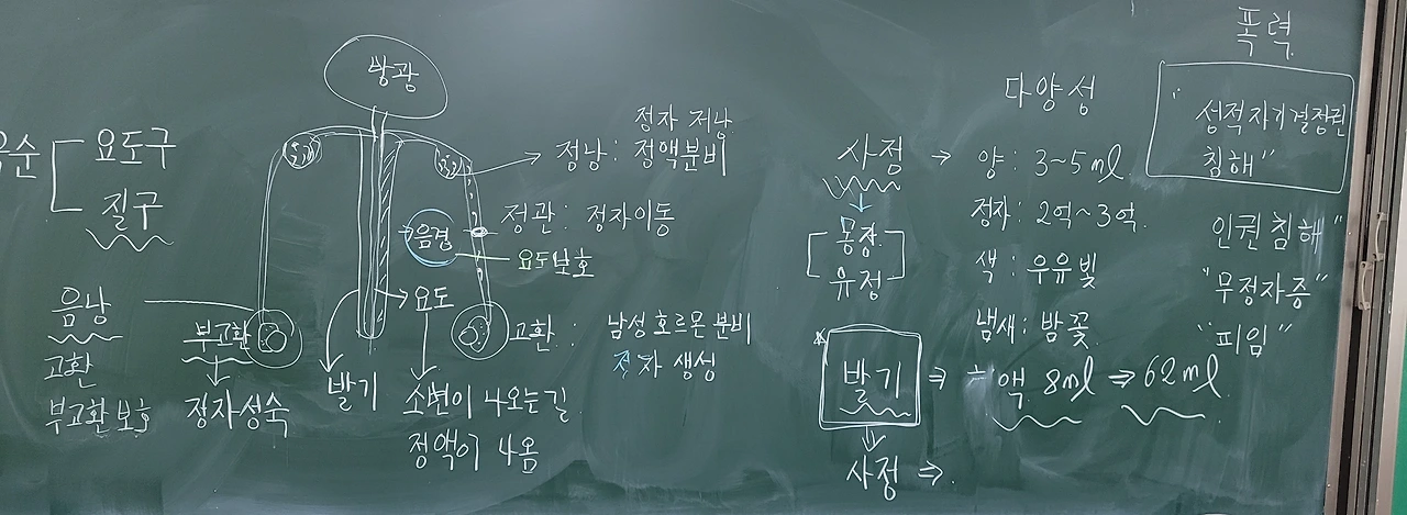 이후, 남자 생식기의 명칭과 역할에 대해 설명했다. 예를 들어, 음경은 소변과 정액이 나오는 통로인 요도를 감싸고 있고, 음낭은 고환과 부고환을 보호 한하다는 식으로 말이다. 고환에 대해서는 학생들이 잘 알고 있었다. '카스트라토'에 대한 설명으로 고환의 중요성과 성평등, 인권침해 등에 대해 이야기를 나누었다. 한 학생이 '무정자증'이라는 말을 들어본 적 있다며 무엇인지 궁금하다고 해서 설명했다.
