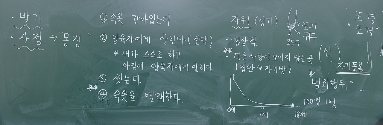 50대가 되어도 아내가 없으면 자신이 먹을 밥 한 끼 차리지 못하고 세탁기도 돌리지 못하는 사람이 주변에 있다. 꽤 많이 말이다. 특히 성적인 부분에서 자기 돌봄이 부족해 사회적으로 문제가 되는 사건을 언론을 통해 접하기도 한다. 그렇기에 나는 몽정이나 자위와 같은 사춘기 성적 변화에 관한 교육이 학교뿐 아니라 가정에서 양육자가 먼저 관심을 가지고 함께 해야 한다고 생각한다.