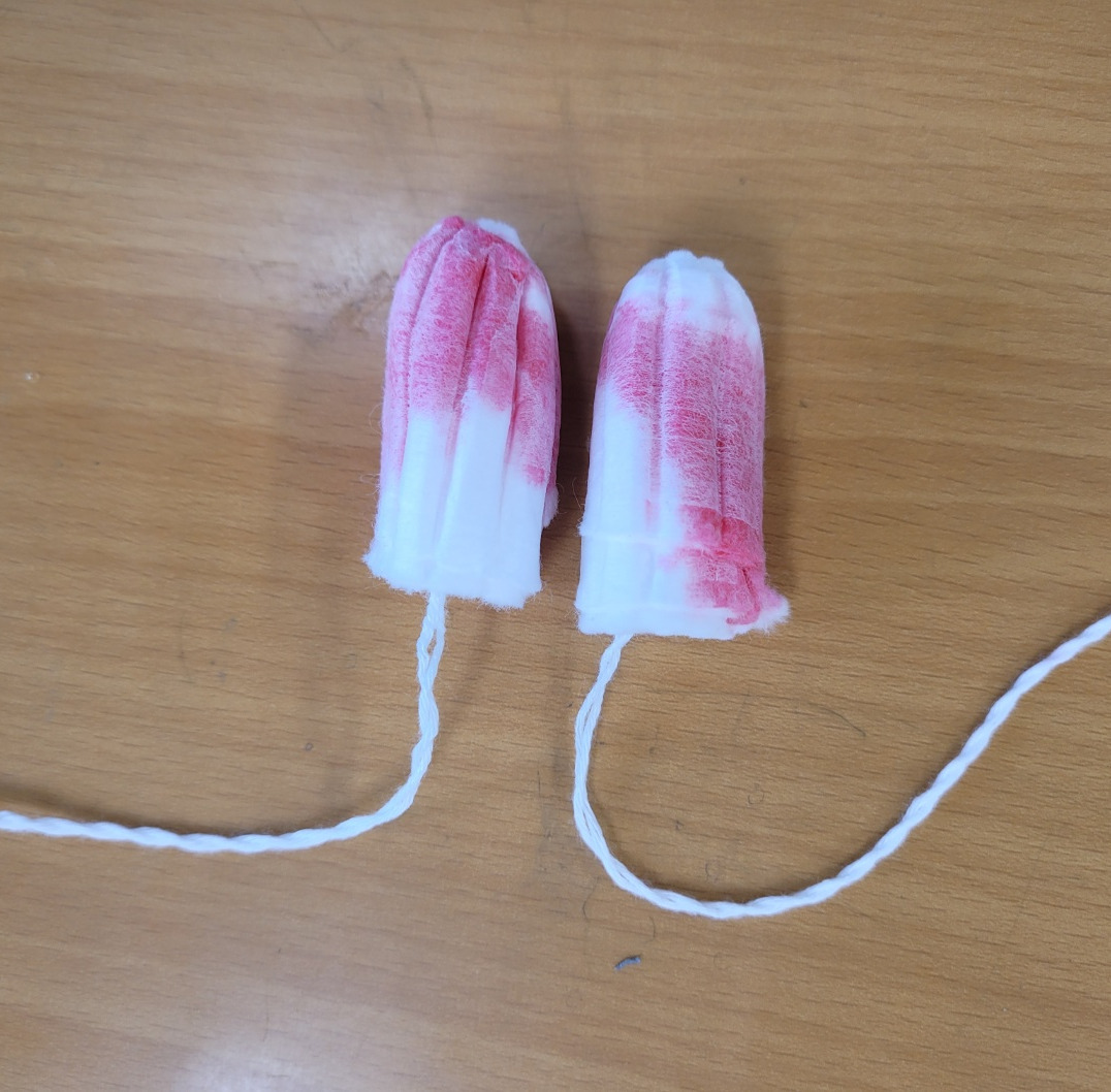 탐폰은 질에 삽입하는 월경용품이다. 탐폰에 빨간 물감이 섞인 물을 부어주었다. 탐폰이 물을 흡수하여 천천히 부풀어 오르는 모습을 보고 학생들이 신기하다는 표정을 지었다.