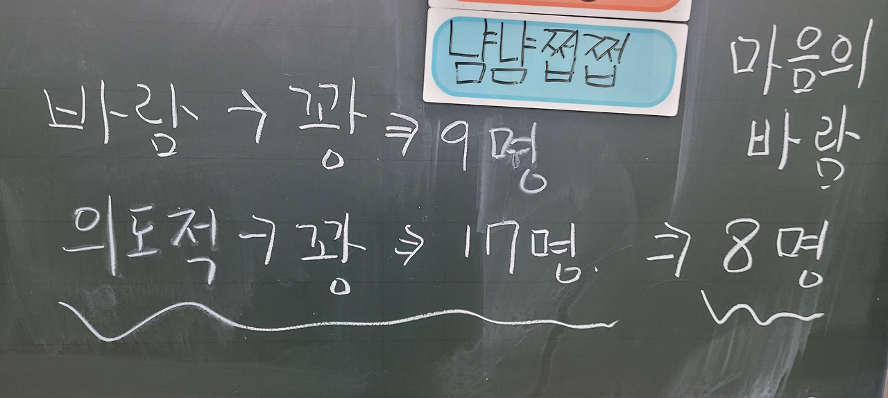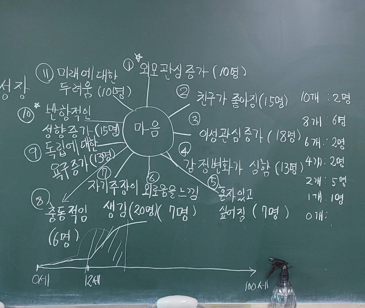 각 항목별로 해당하는 학생은 손을 들게 했다. 학생들은 친구들 변화를 확인하면서 웃음을 터트렸다. 친구도 자신과 비슷한 변화를 겪고 있다는 것이 학생들에게 위안이 되었고, 함께 성장하고 있다는 공동체 의식을 느끼게 했다.