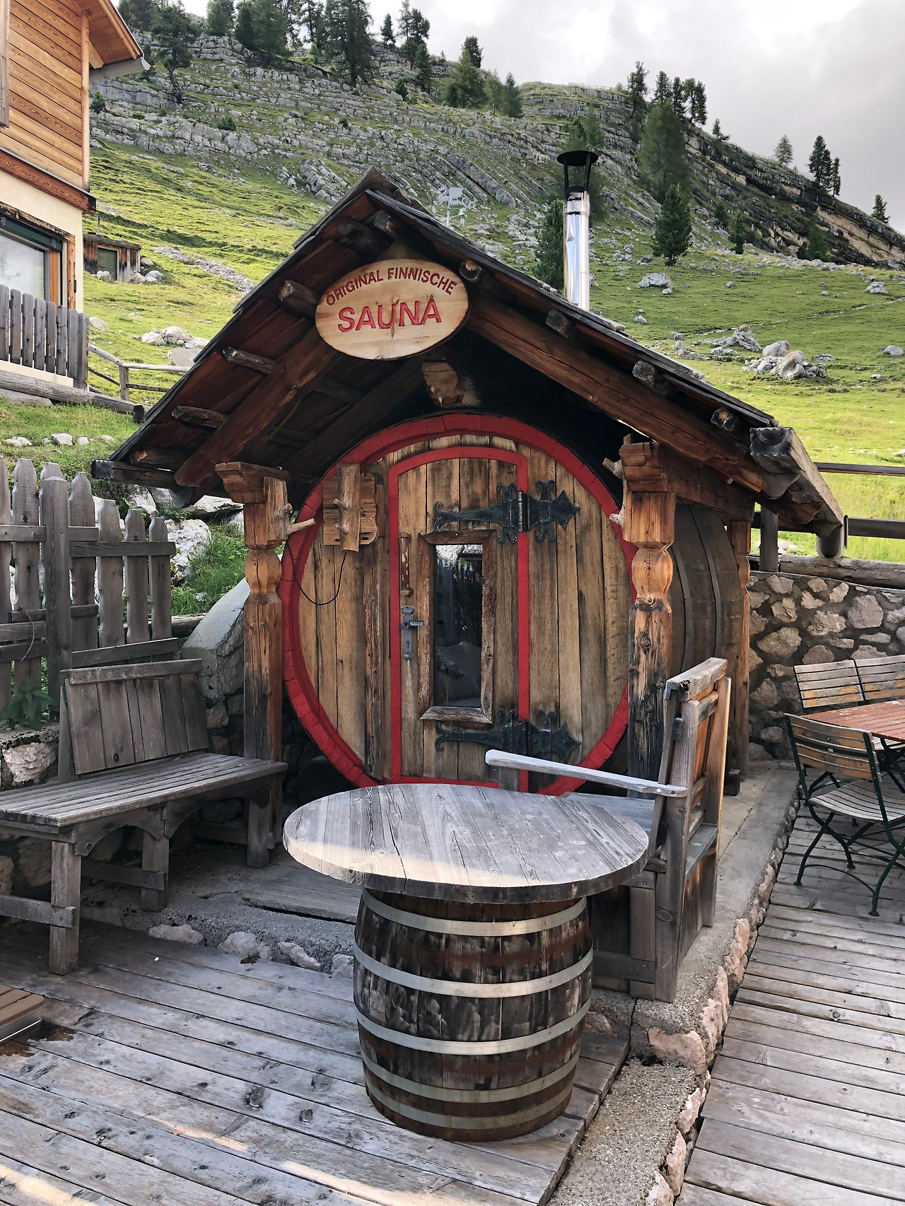 산장 옆에는 나무로 만든 거대한 술통에 지붕을 얹은 모습의 사우나통과 유아용 워터파크에나 있을법한 작은 물통이 매달려 있었다. 네 명이 들어가면 꽉 차는 핀란드식 사우나통은 돌로미테 트레킹과 환상의 조합을 이루었다. 장거리 걷기로 지친 몸이지만 일행과 함께 워터파크에 놀러 온 아이들처럼 속옷만 입고 자연 속에 뛰어들었다. 산에서 흘러온 차가운 물을 끼얹고 난 뒤 통 안에서 뜨거운 사우나를 즐기다 보면 하루의 피로가 감쪽같이 사라졌다. 산장 투숙객들의 구경거리가 되는 것쯤 은 기꺼이 받아들일 수 있었다. 이렇게 한국에서 온 아저씨 네 명은 돌로미테 사우나에 푹 빠졌고, 앞으로 트레킹 코스에 있는 모든 사우나는 다 가기로 굳은 약속을 했다.