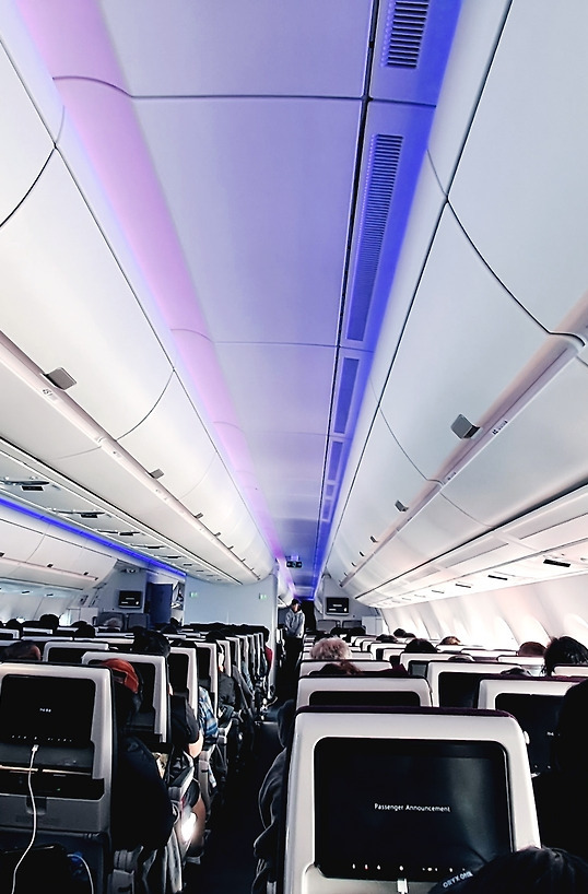 좌석을 찾는 동안 좌석 위 화물칸을 살폈다. 조금 늦게 탑승한 탓인지 여유가 많지 않아 짐을 두 군데로 나누어 실어야 했다. 짐을 정리하고 자리에 앉아 기내를 천천히 둘러보니, 인천에서 탔던 비행기보다 훨씬 깨끗하고 전반적으로 새것 같은 느낌이 들었다. 기체가 오래되지 않은 듯했고, 그 사실만으로도 마음 한쪽이 차분히 가라앉았다. 긴 여정을 이어가는 사람에게 기내의 상태가 주는 안정감은 생각보다 컸다.